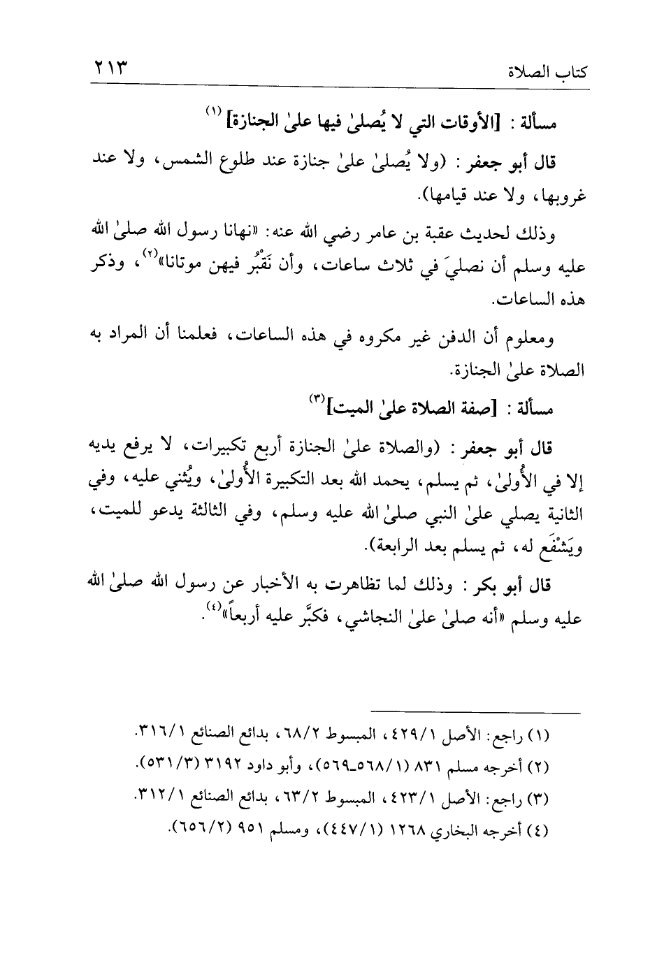 قال أبو جعفر: (ولا يصلي على جنازة عند طلوع الشمس، ولا عند غروبها، ولا عند قيامها).