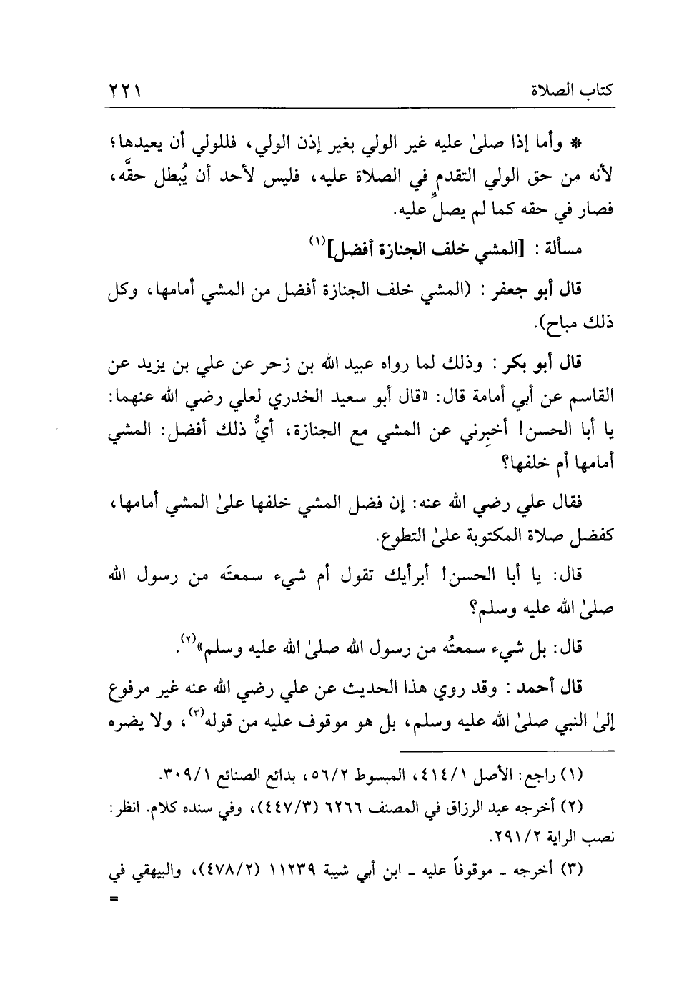 فقال علي رضي الله عنه: إن فضل المشي خلفها على المشي أمامها، كفضل صلاة المكتوبة على التطوع.