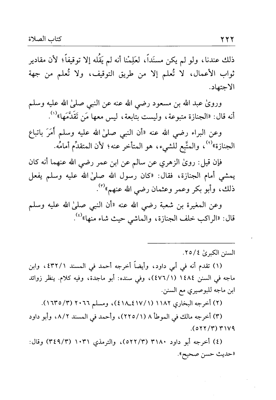 وروي عبد الله بن مسعود رضي الله عنه عن النبي صلى الله عليه وسلم أنه قال: "الجنازة متبوعة، وليست بتابعة، ليس معها من تقدمها".