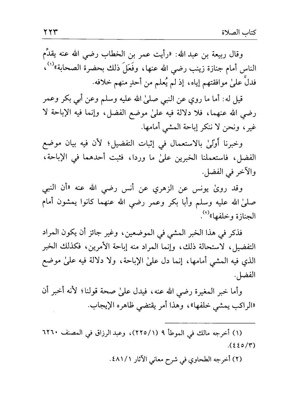 قيل له: أما ما روي عن النبي صلى الله عليه وسلم وعن أبي بكر وعمر رضي الله عنهما، فلا دلالة فيه على موضع الفضل، وإنما فيه الإباحة لا غير، ونحن لا ننكر إباحة المشي أمامها.