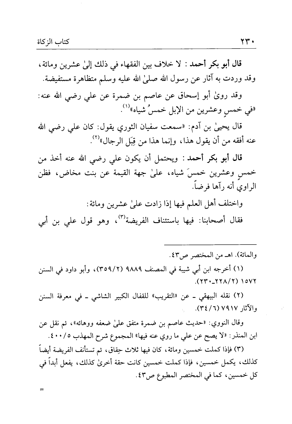 وقد روى أبو إسحاق عن عاصم بن ضمرة عن علي رضي الله عنه: "في خمس وعشرين من الإبل خمس شياه".