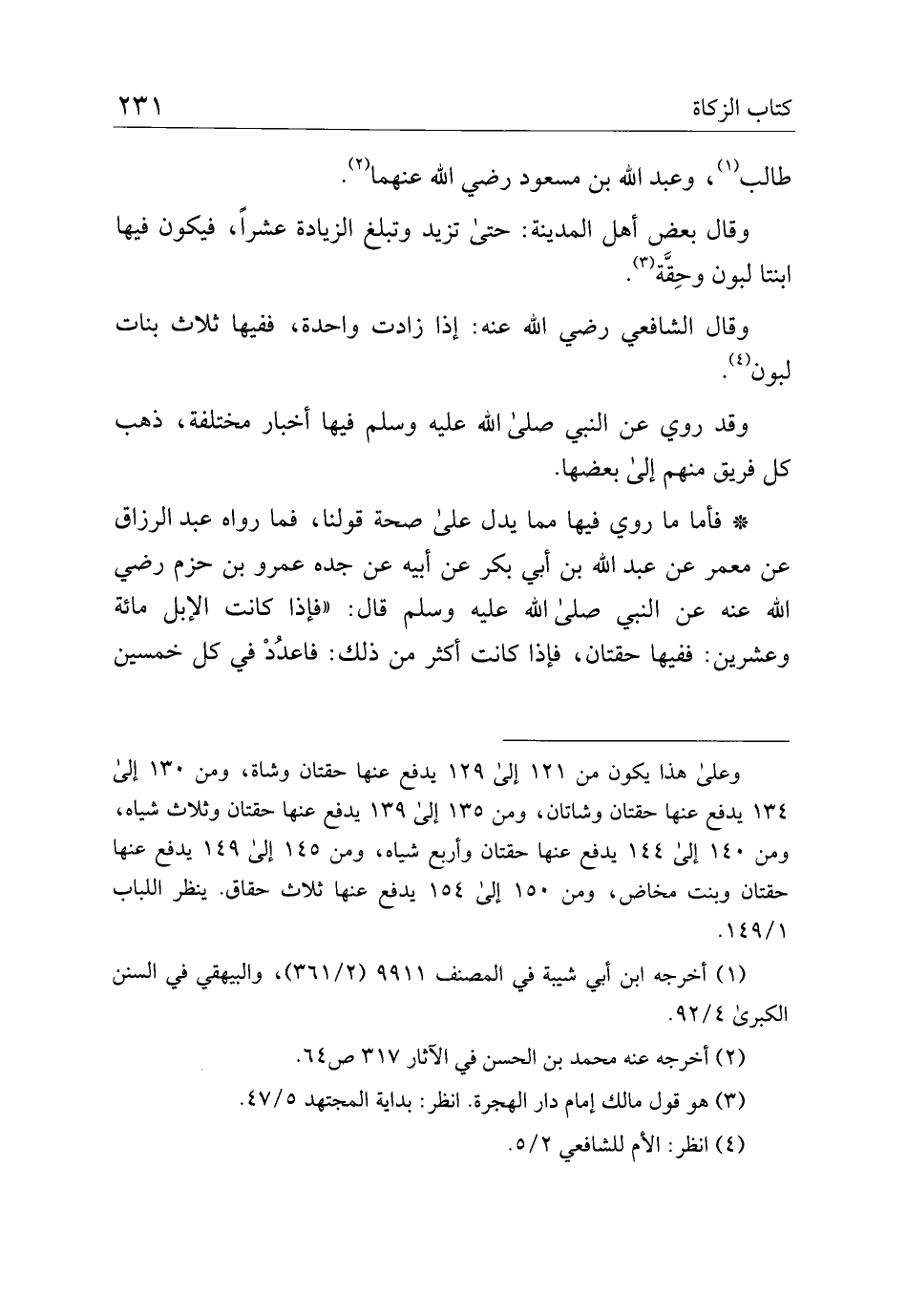 * فأما ما روي فيها مما يدل على صحة قولنا، فما رواه عبد الرزاق عن معمر عن عبد الله بن أبي بكر عن أبيه عن جده عمرو بن حزم رضي الله عنه عن النبي صلى الله عليه وسلم قال: "فإذا كانت الإبل مائة وعشرين: ففيها حقتان، فإذا كانت أكثر من ذلك: فاعدد في كل خمسين