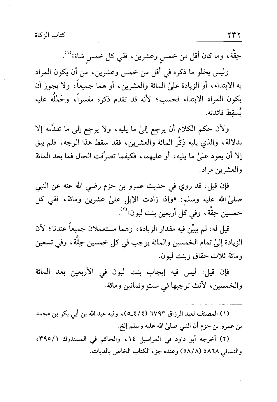 قيل له: لم يبين فيه مقدار الزيادة، وهما مستعملان جميعًا عندنا؛ لأن الزيادة إلى تمام الخمسين والمائة يوجب في كل خمسين حقة، وفي تسعين ومائة ثلاث حقاق وبنت لبون.