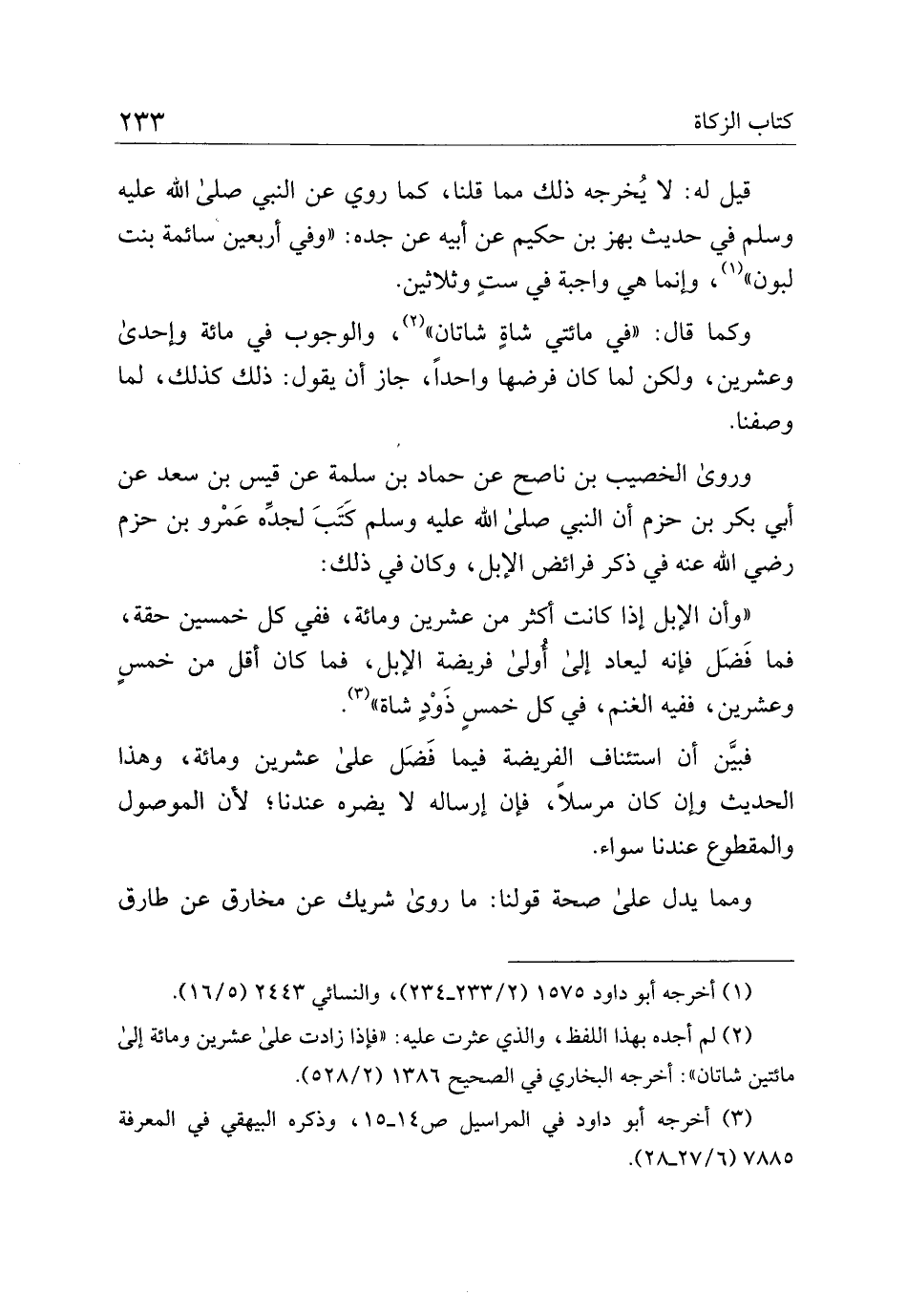 "وأن الإبل إذا كانت أكثر من عشرين ومائة، ففي كل خمسين حقة، فما فضل فإنه ليعاد إلى أولى فريضة الإبل، فما كان أقل من خمس وعشرين، ففيه الغنم، في كل خمس ذود شاة".