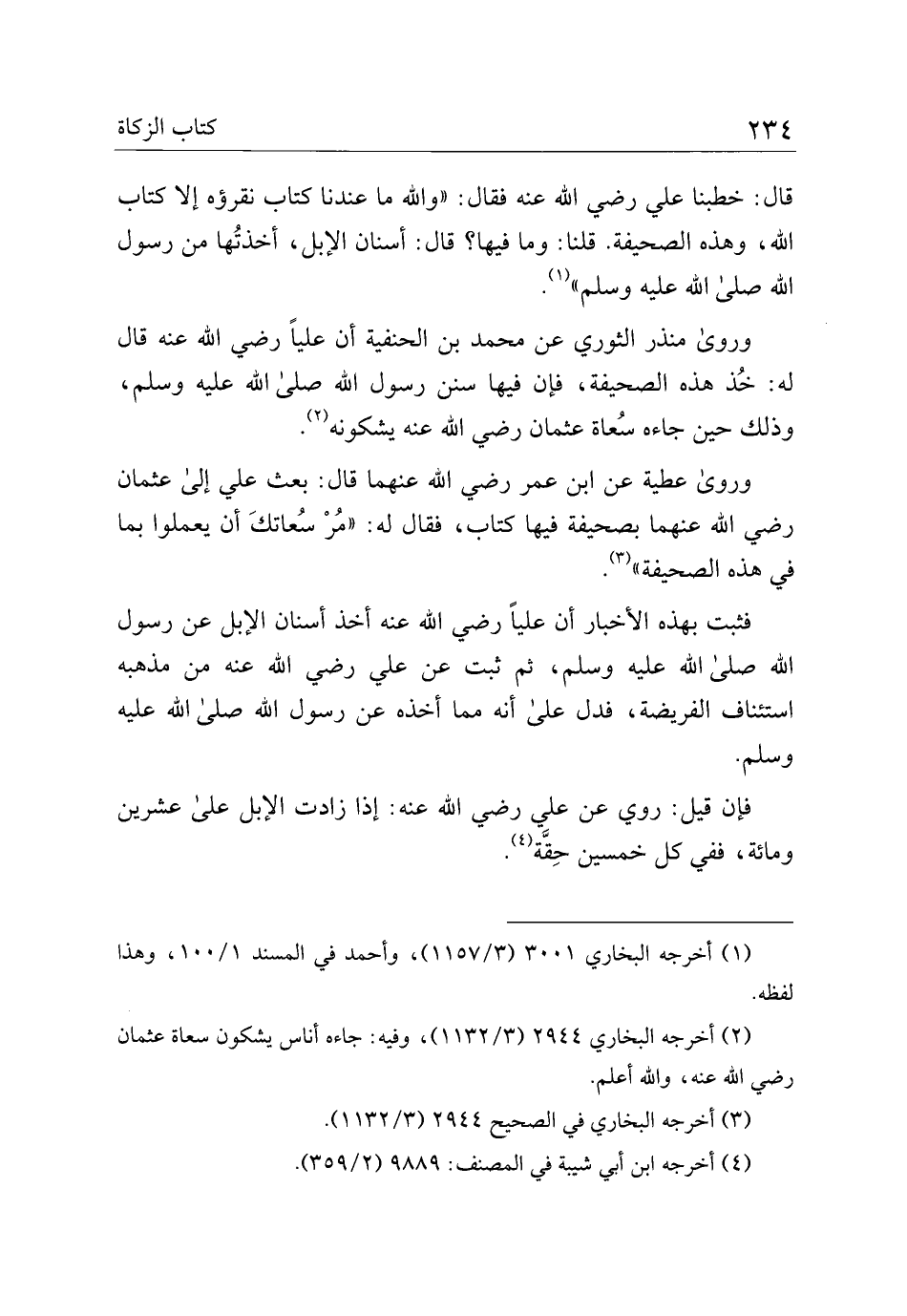 قال: خطبنا علي رضي الله عنه فقال: "والله ما عندنا كتاب نقرؤه إلا كتاب الله، وهذه الصحيفة، قلنا: وما فيها؟ قال: أسنان الإبل، أخذتها من رسول الله صلى الله عليه وسلم".
