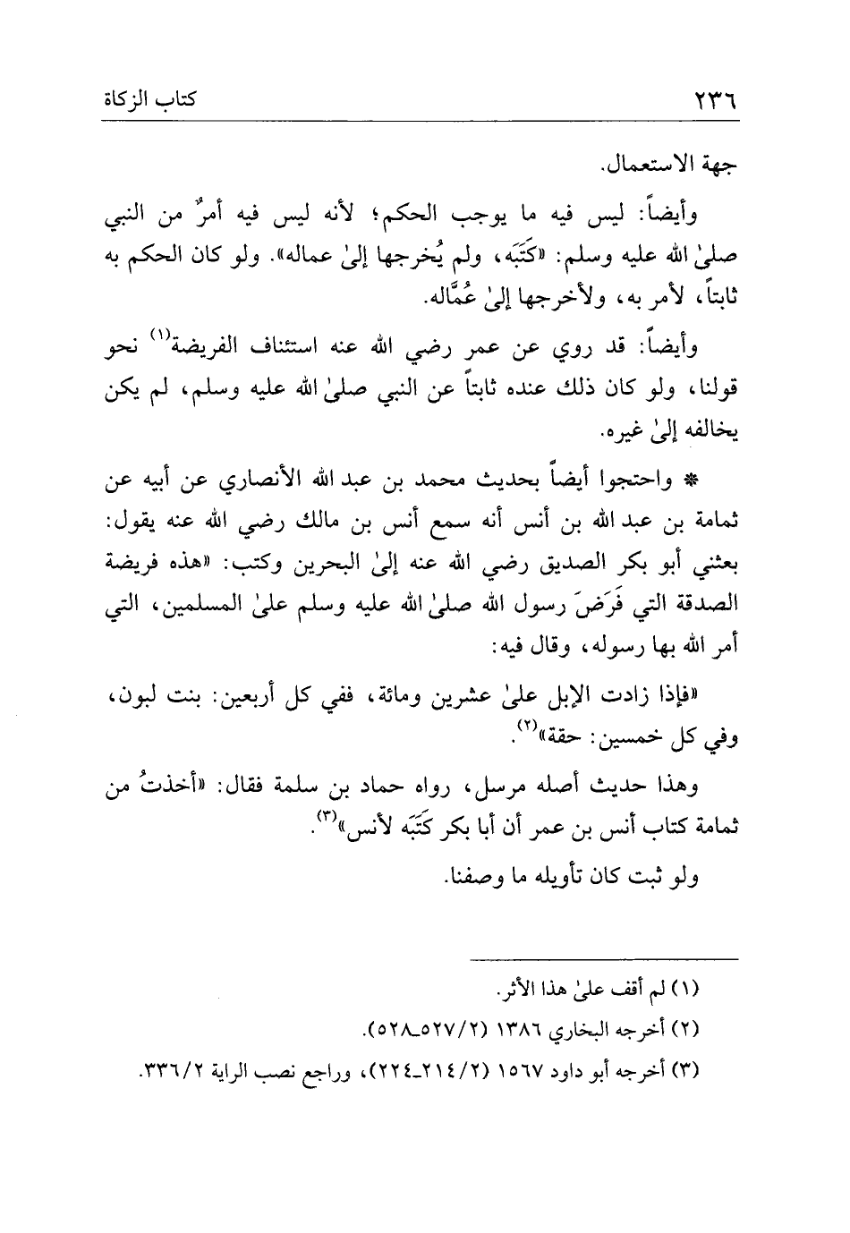 * واحتجوا أيضًا بحديث محمد بن عبد الله الأنصاري عن أبيه عن ثمامة بن عبد الله بن أنس أنه سمع أنس بن مالك رضي الله عنه يقول: بعثني أبو بكر الصديق رضي الله عنه إلى البحرين وكتب: "هذه فريضة الصدقة التي فرض رسول الله صلى الله عليه وسلم على المسلمين، التي أمر بها رسوله، وقال فيه:
