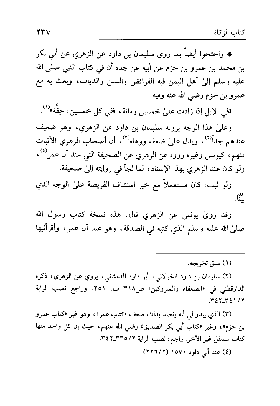 * واحتجوا أيضًا بما روى سليمان بن داود عن الزهري عن أبي بكر بن محمد بن عمرو بن حزم عن أبيه عن جده أن في كتاب النبي صلى الله عليه وسلم إلى أهل اليمن فيه الفرائض والسنن والديات، وبعث به مع عمرو بن حزم رضي الله عنه وفيه: