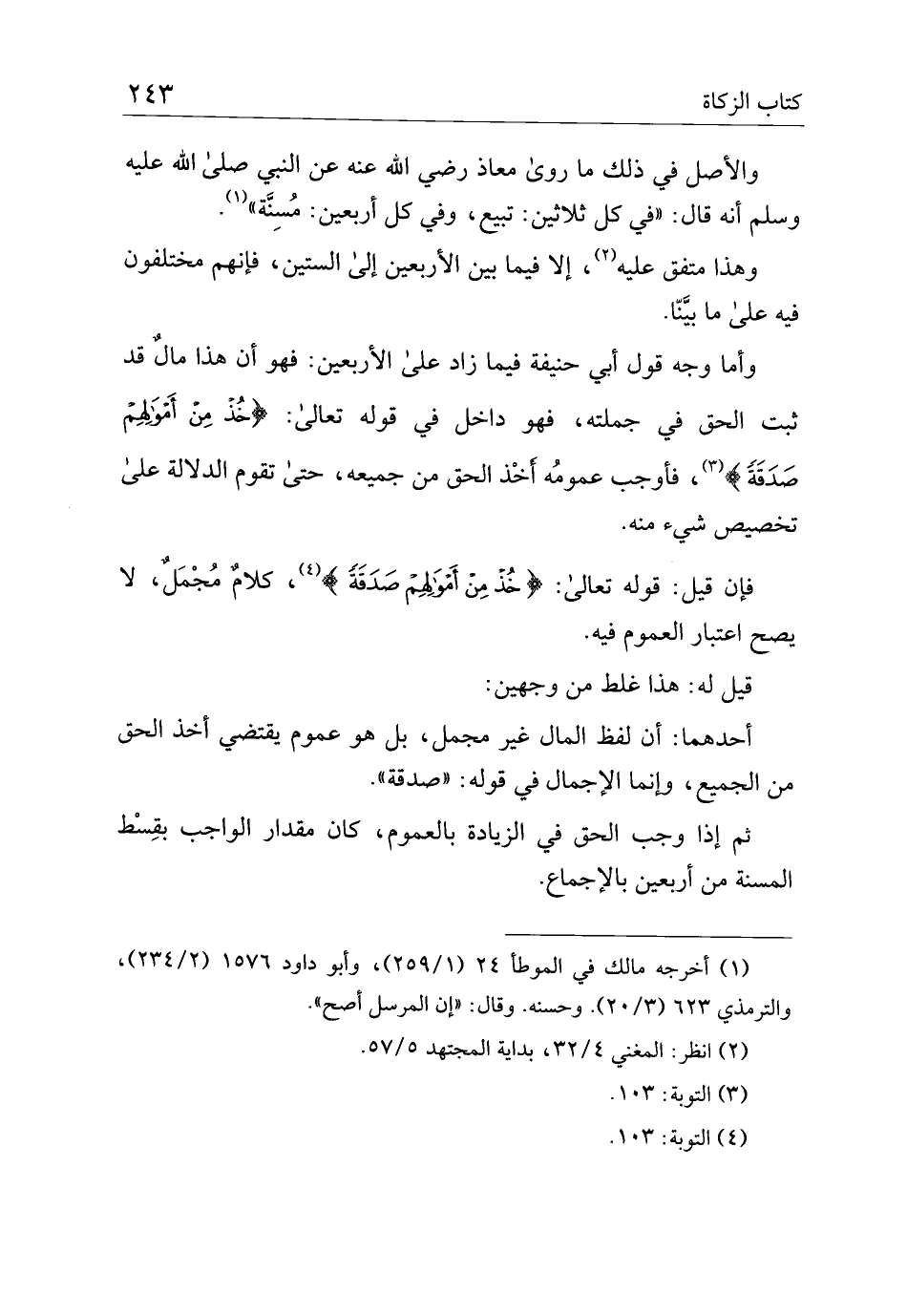 أحدهما: أن لفظ المال غير مجمل، بل هو عموم يقتضي أخذ الحق من الجميع، وإنما الإجمال في قوله: "صدقة".