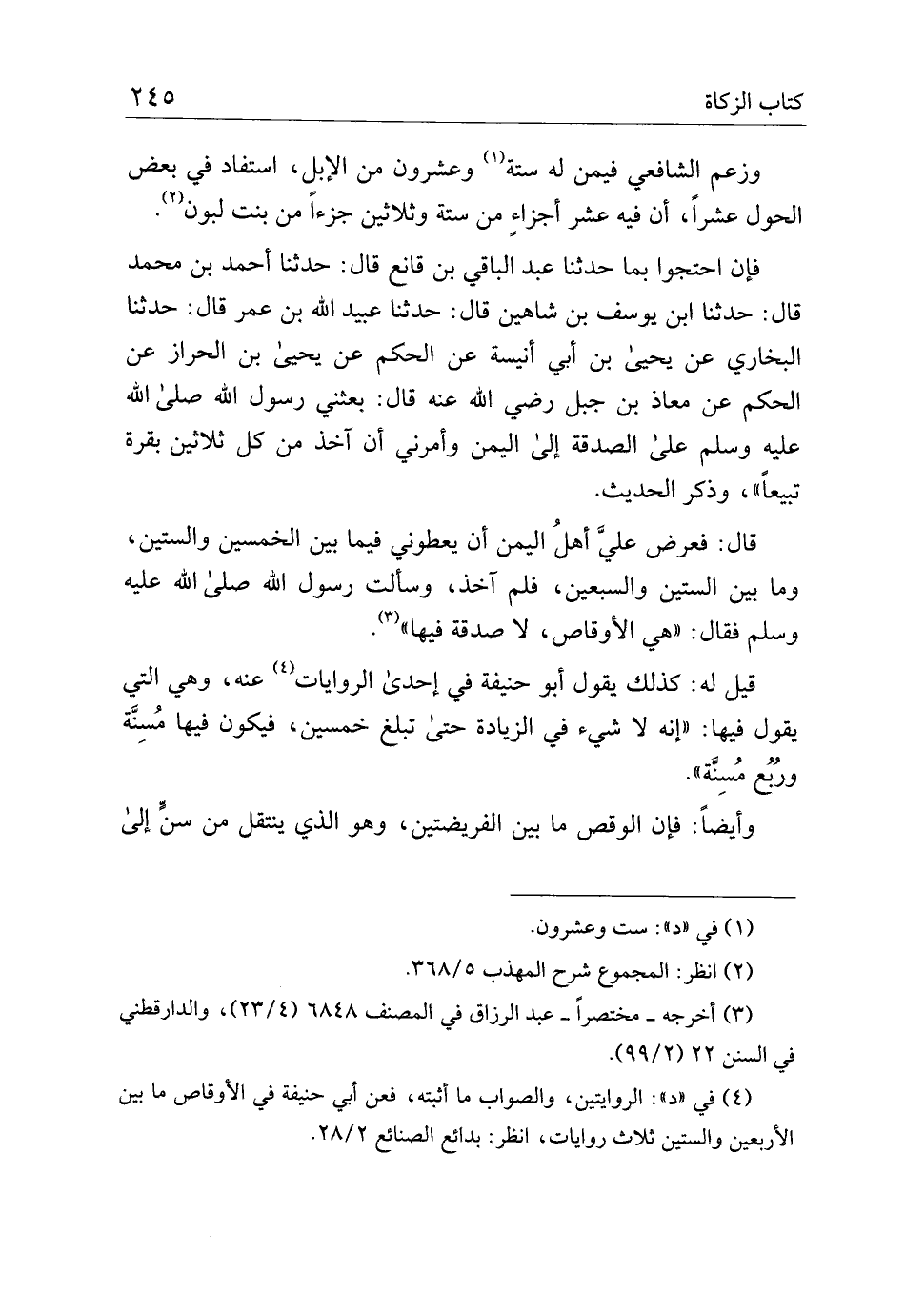 فإن احتجوا بما حدثنا عبد الباقي بن قانع قال: حدثنا أحمد بن محمد قال: حدثنا ابن يوسف بن شاهين قال: حدثنا عبيد الله بن عمر قال: حدثنا البخاري عن يحيي بن أبي أنسة عن الحكم عن يحيي بن الحراز عن الحكم عن معاذ بن جبل رضي الله عنه قال: بعثني رسول الله صلى الله عليه وسلم على الصدقة إلى اليمن وأمرني أن آخذ من كل ثلاثين بقرة تبيعًا"، وذكر الحديث.