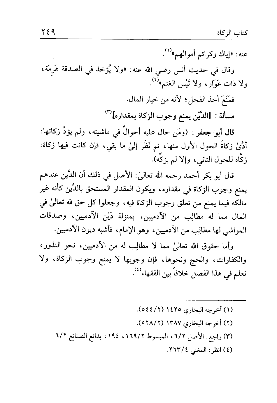 قال أبو بكر أحمد رحمه الله تعالى: الأصل في ذلك أن الدين عندهم يمنع وجوب الزكاة في مقداره، ويكون المقدار المستحق بالدين كأنه غير مالكه فيما يمنع من تعلق وجوب الزكاة فيه، وجعلوا كل حق لله تعالى في المال مما له مطالب من الآدميين، بمنزلة دين الآدميين، وصدقات المواشي لها مطالب من الآدميين، وهو الإمام، فأشبه ديون الآدميين.