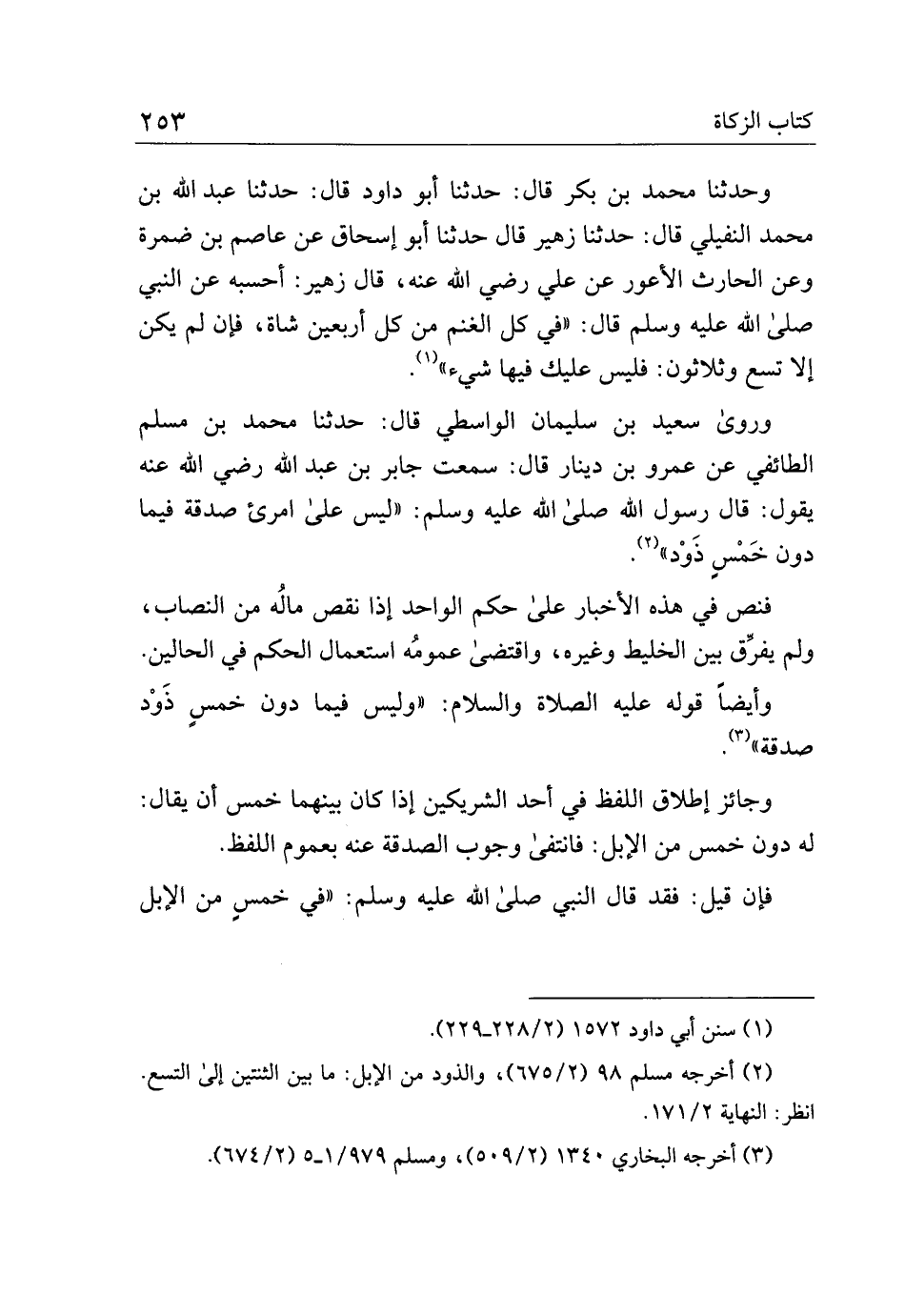 وروى سعيد بن سليمان الواسطي قال: حدثنا محمد بن مسلم الطائفي عن عمرو بن دينار قال: سمعت جابر بن عبد اله رضي الله عنه يقولك قال رسول الله صلى الله عليه وسلم: "ليس على امرئ صدقة فيما دون خمس ذود".
