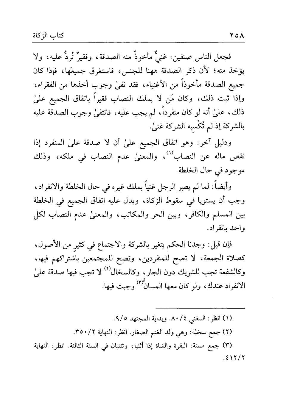ودليل آخر: وهو اتفاق الجميع على أن لا صدقة على المفرد إذا نقص ماله عن النصاب، والمعنى عدم النصاب في ملكه، وذلك موجود في حال الخلطة.