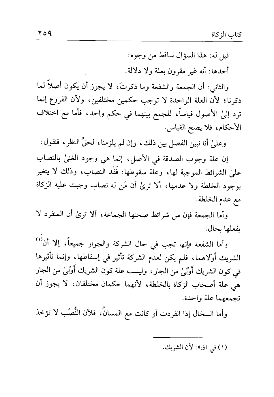 وأما الشفعة فإنها تجب في حال الشركة والجوار جميعًا، إلا أن الشريك أولاهما، فلم يكن لعدم الشركة تأثير في إسقاطها، وإنما تأثيرها في كون الشريك أولى من الجار، وليست علة كون الشريك أولى من الجار هي علة أصحاب الزكاة بالخلطة، لأنهما حكمان مختلفان، لا يجوز أن تجمعهما علة واحدة.