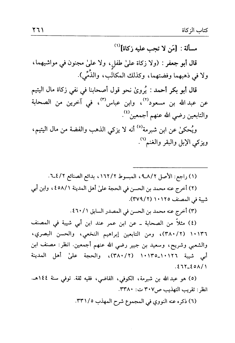 قال أبو بكر أحمد: يروى نحو قول أصحابنا في نفي زكاة مال اليتيم عن عبد الله بن مسعود، وابن عباس، في آخرين من الصحابة والتابعين رضي الله عنهم أجمعين.