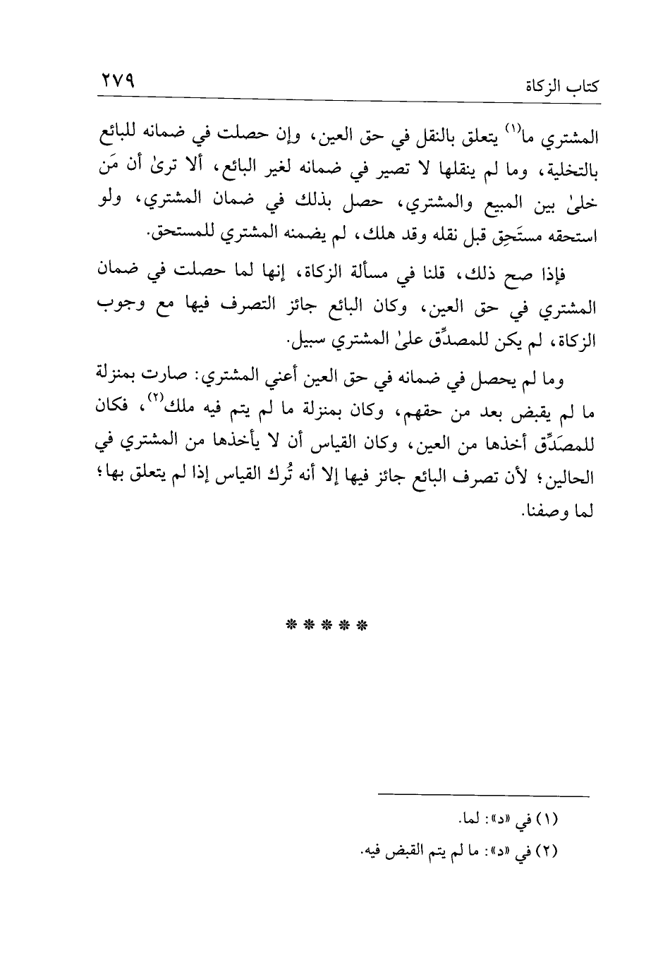فإذا صح ذلك، قلنا في مسألة الزكاة، إنها لما حصلت في ضمان المشتري في حق العين، وكان البائع جائز التصرف فيها مع وجوب الزكاة، لم يكن للمصدق على المشتر ي سبيل.