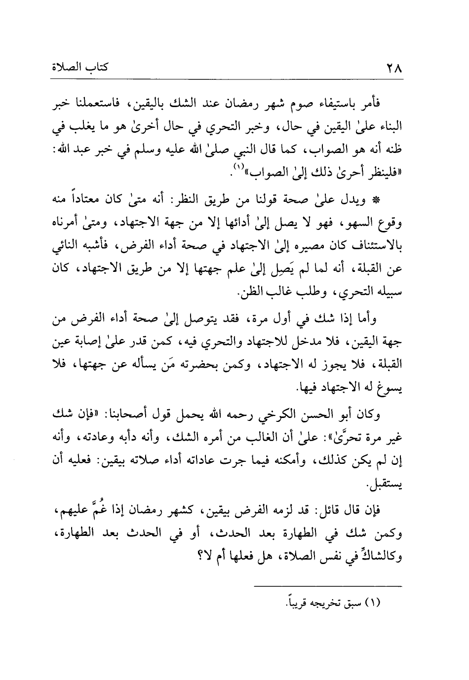 وكان أبو الحسن الكرخي رحمه الله يحمل قول أصحابنا: "فإن شك غير مرة تحري": على أن الغالب من أمره الشك، وأنه دأبه وعادته، وأنه إن لم يكن كذلك، وأمكنه فيما جرت عاداته أداء صلاته بيقين: فعليه أن يستقبل.