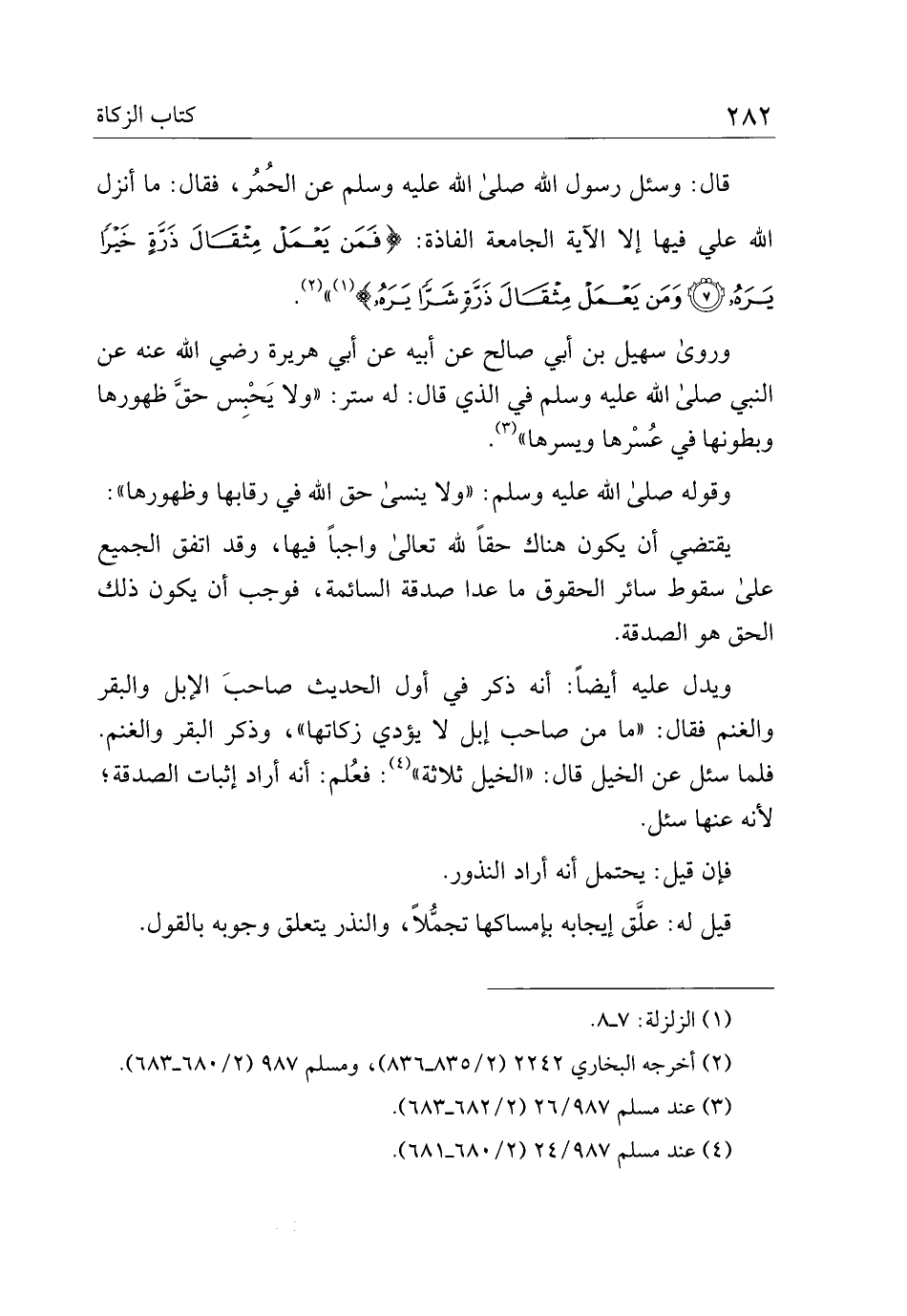 ويدل عليه أيضًا: أنه ذكر في أول الحديث صاحب الإبل والبقر والغنم فقال: "ما من صاحب إبل لا يؤدي زكاتها"، وذكر البقر والغنم. فلما سئل عن الخيل قال: "الخيل ثلاثة"، فعلم: أنه أراد إثبات الصدقة؛ لأنه عنها سئل.