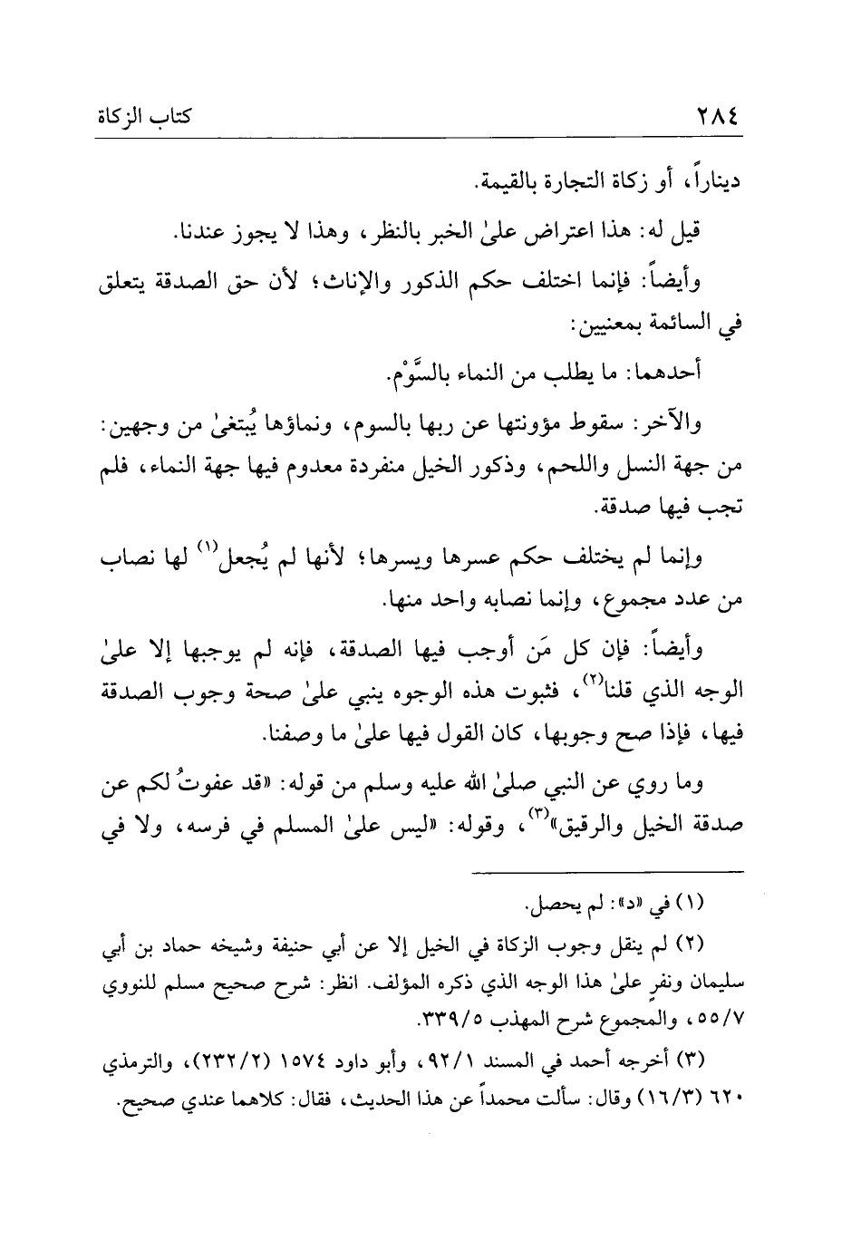 وما روي عن النبي صلى الله عليه وسلم من قوله: "قد عفوت لكم عن صدقة الخيل والرقيق"، وقوله: "ليس على المسلم في فرسه، ولا في