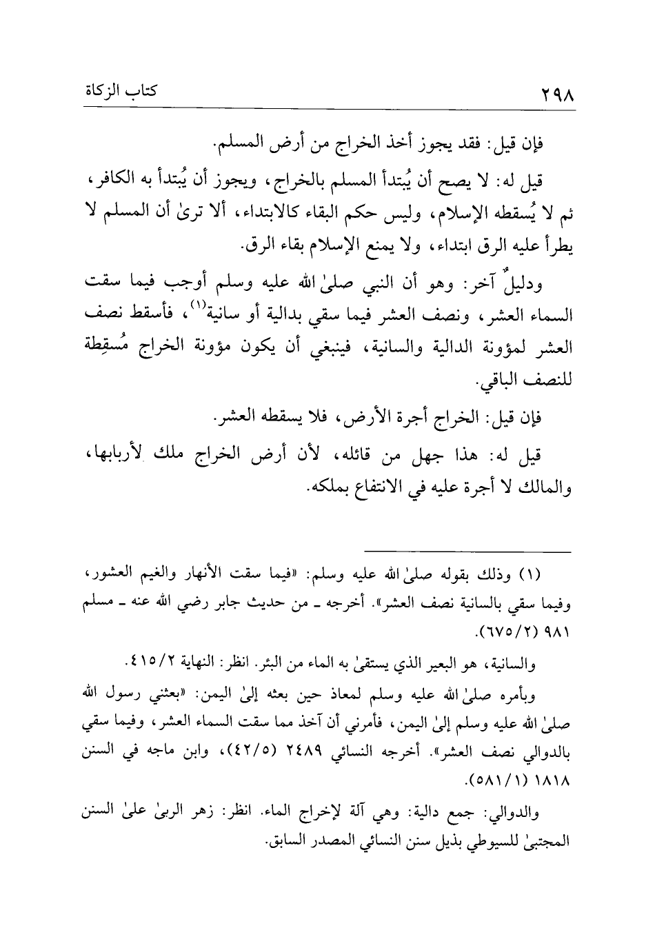 ودليل آخر: وهو أن النبي صلى الله عليه وسلم أوجب فيما سقت السماء العشر، ونصف العشر فيما سقي بدالية أو سانية، فأسقط نصف العشر لمؤونة الدالية والسانية، فينبغي أن يكون مؤونة الخراج مسقطة للنصف الباقي.