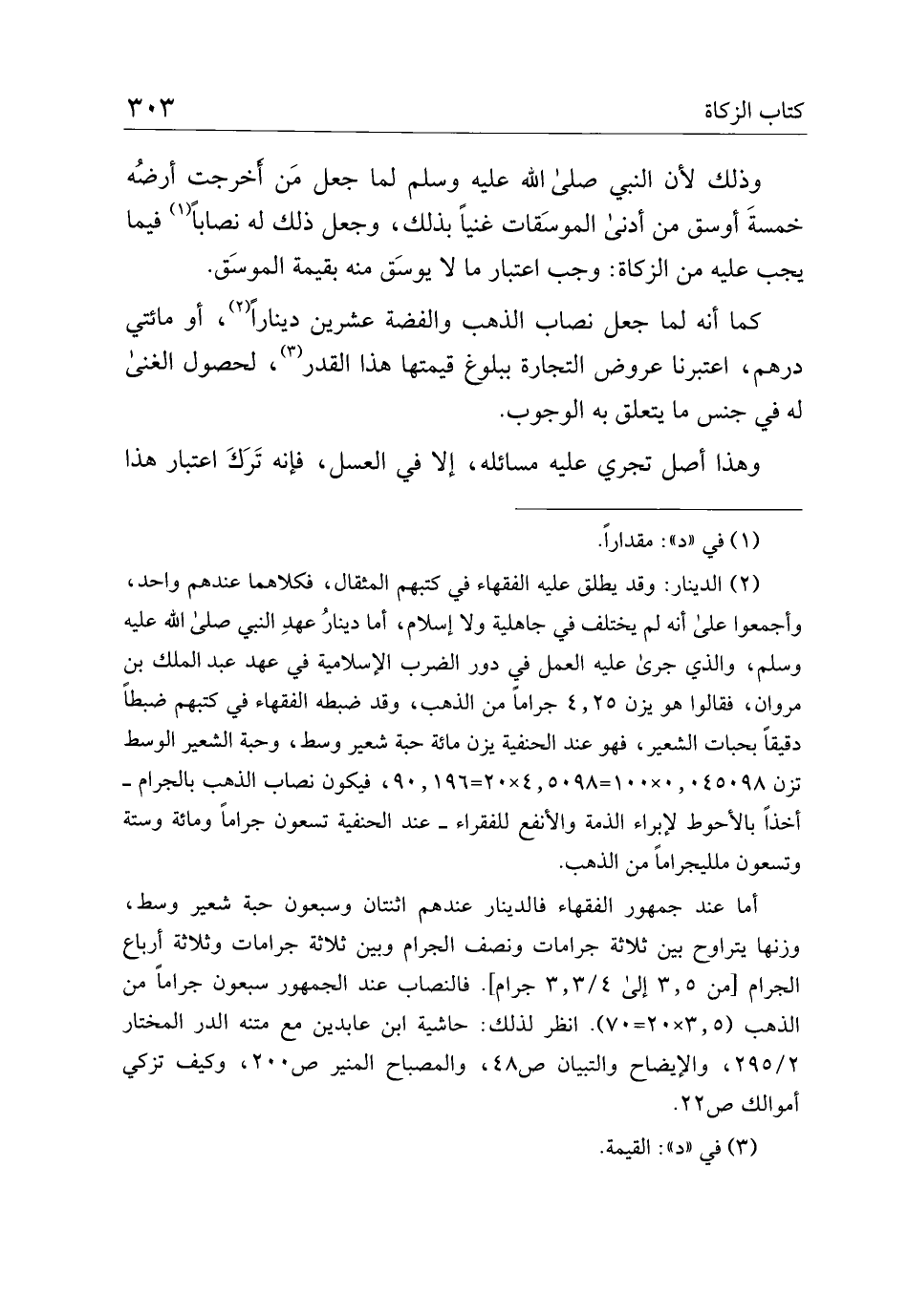 كما أنه لما جعل نصاب الذهب والفضة عشرين دينارًا، أو مائتي درهم، اعتبرنا عروض التجارة ببلوغ قيمتها هذا القدر، لحصول الغنى له في جنس ما يتعلق به الوجوب.
