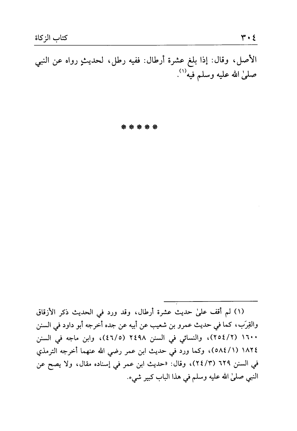 الأصل، وقال: إذا بلغ عشرة أرطال: ففيه رطل، لحديثٍ رواه عن النبي صلى الله عليه وسلم فيه.