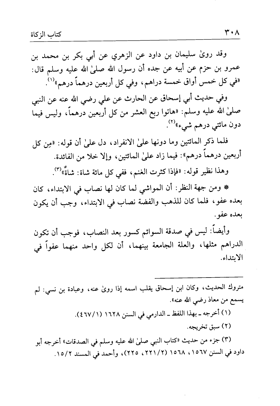 وقد روى سليمان بن داود عن الزهري عن أبي بكر بن محمد بن عمرو بن حزم عن أبيه عن جده أن رسول الله صلى الله عليه وسلم قال: "في كل خمس أواق خمسة دراهم، وفي كل أربعين درهمًا درهم".