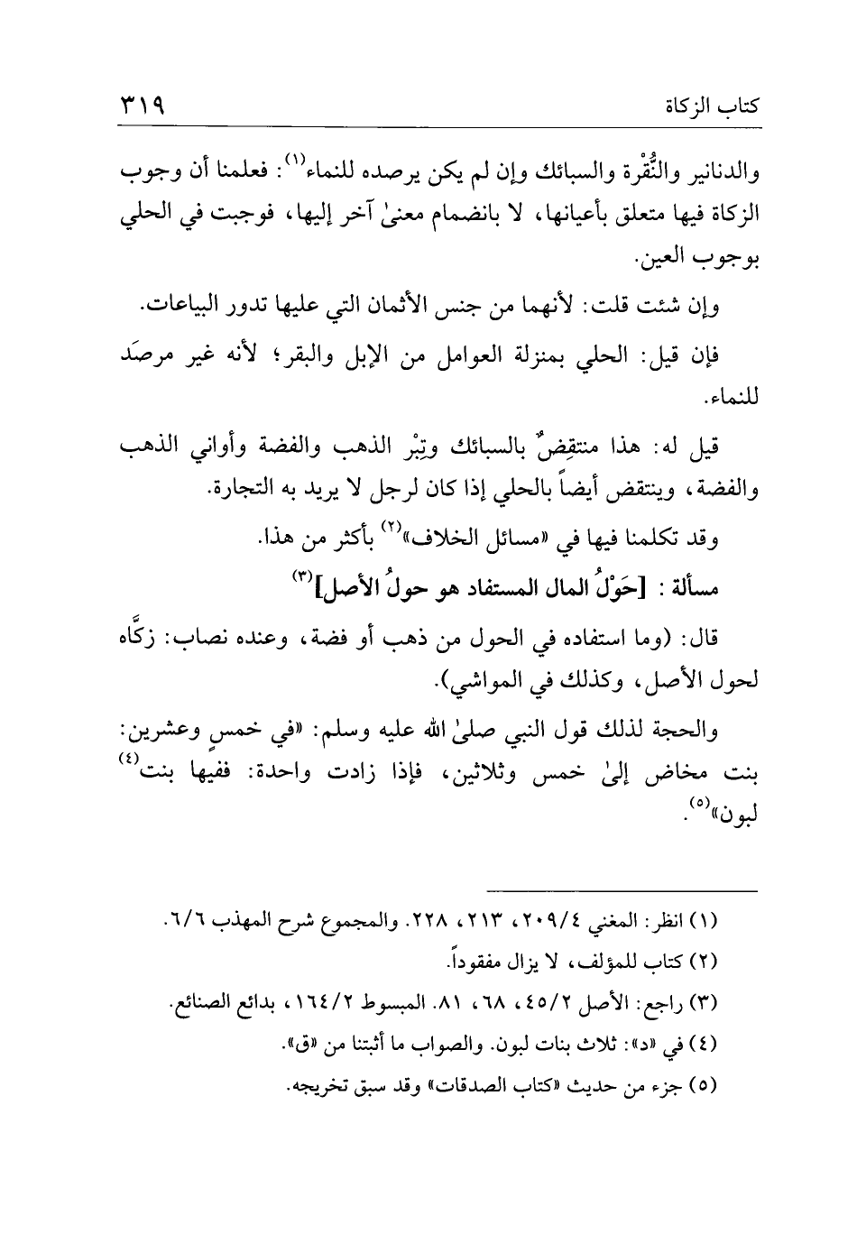 والدنانير والنقرة والسبائك وإن لم يكن يرصده للنماء: فعلمنا أن وجوب الزكاة فيها متعلق بأعيانها، لا بانضمام معنى آخر إليها، فوجبت في الحلي بوجوب العين.