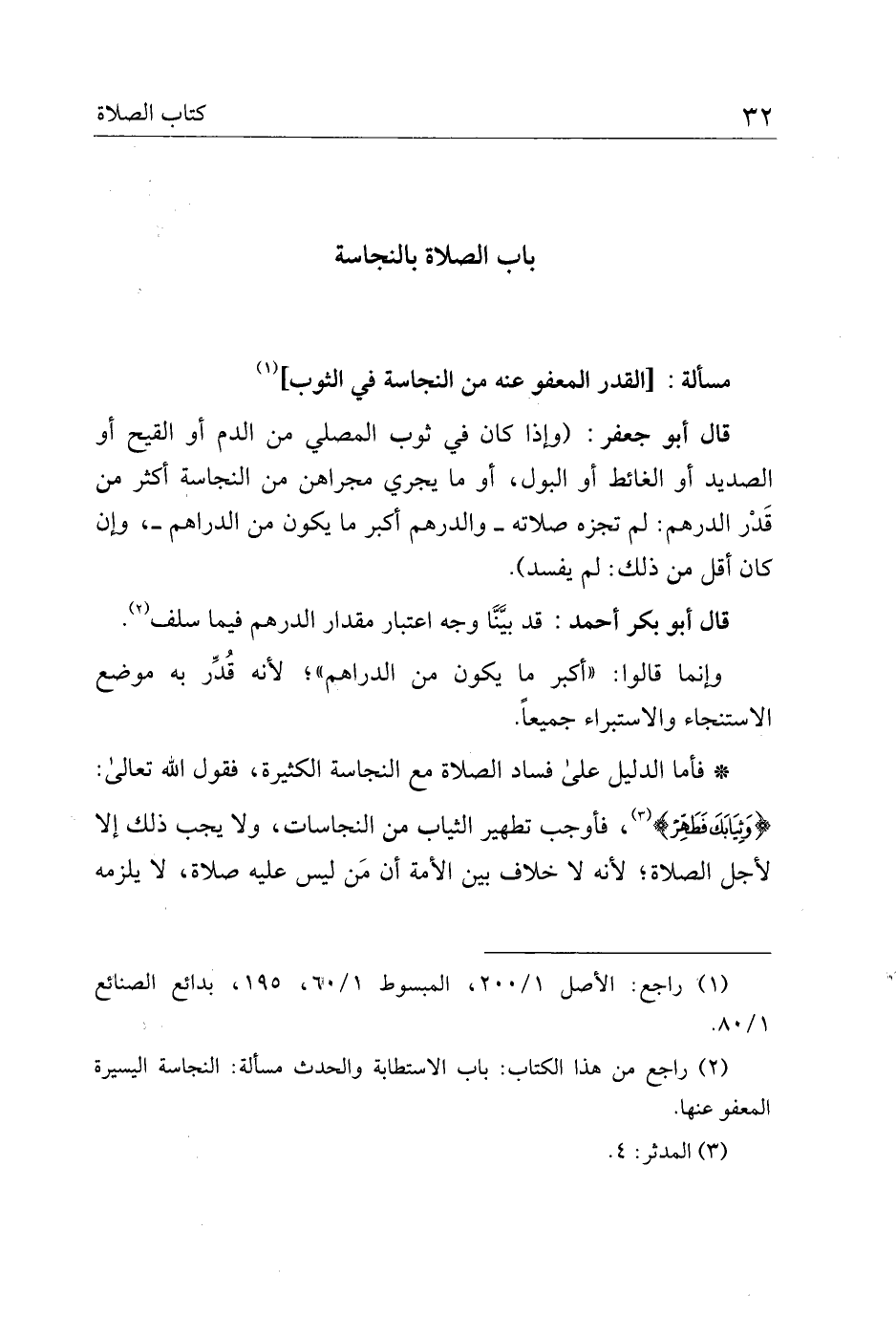 قال أبو جعفر: (وإذا كان في ثوب المصلي من الدم أو القيح أو الصديد أو الغائط أو البول، أو ما يجري مجراهن من النجاسة أكثر من قدر الدرهم: لم تجزه صلاته - والدرهم أكبر ما يكون من الدراهم - وإن كان أقل من ذلك: لم يفسد).