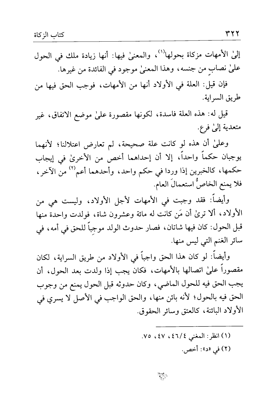 وأيضًا: لو كان هذا الحق واجبًا في الأولاد من طريق السراية، لكان مقصورًا على اتصالها بالأمهات، فكان يجب إذا ولدت بعد الحول، أن يجب الحق فيه للحول الماضي، وكان حدوثه قبل الحول يمنع من وجوب الحق فيه بالحول؛ لأنه بائن منها، والحق الواجب في الأصل لا يسري في الأولاد البائنة، كالعتق وسائر الحقوق.