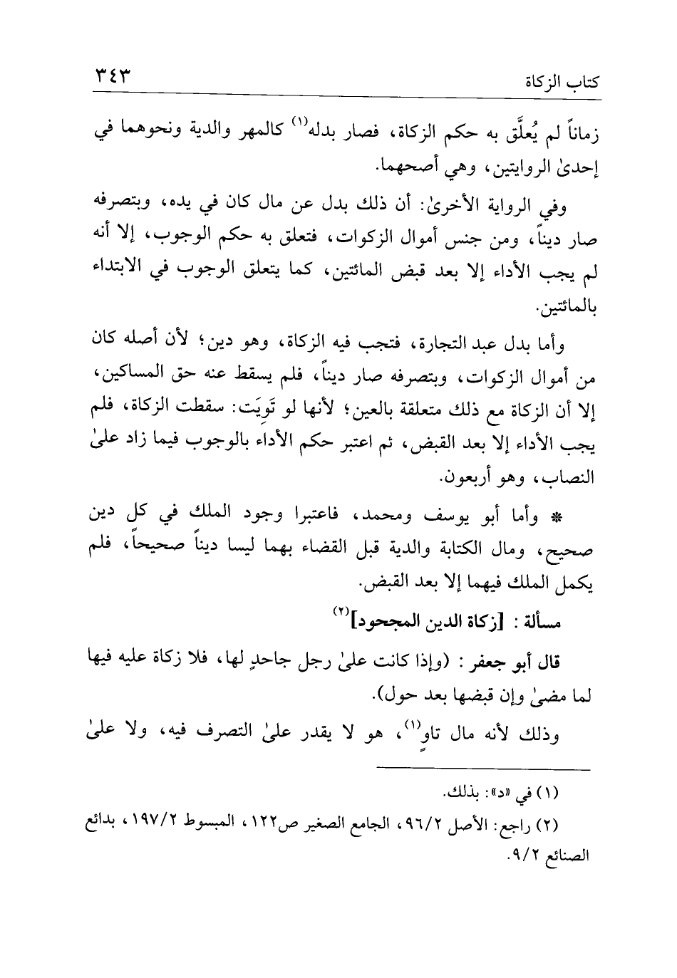 وفي الرواية الأخرى: أن ذلك بدل عن مال كان في يده، وبتصرفه صار دينا، ومن جنس أموال الزكوات، فتعلق به حكم الوجوب، إلا أنه لم يجب الأداء إلا بعد قبض المائتين، كما يتعلق الوجوب في الابتداء بالمائتين.