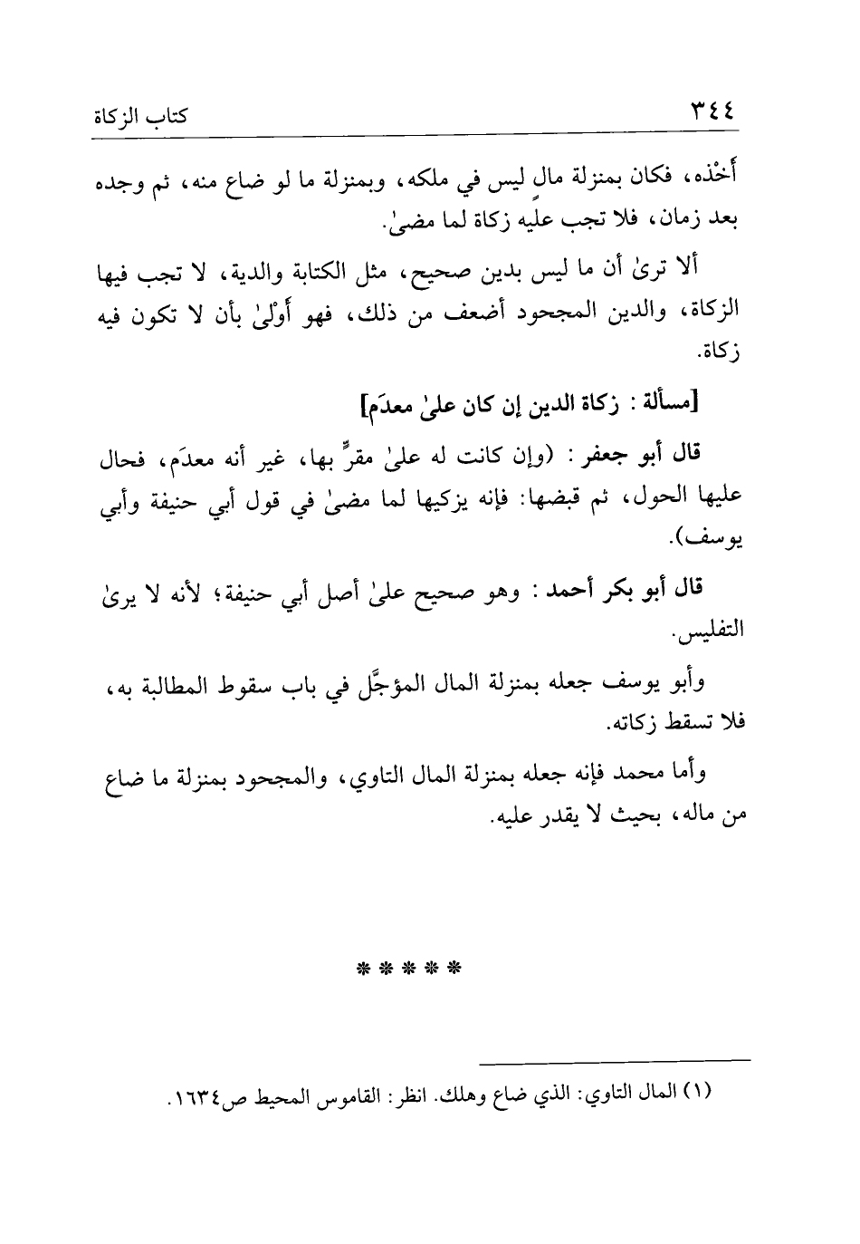 قال أبو جعفر: (وإن كانت له على مقر بها، غير أنه معدم، فحال عليها الحول، ثم قبضها: فإنه يزكيها لما مضى في قول أبي حنيفة وأبي يوسف).
