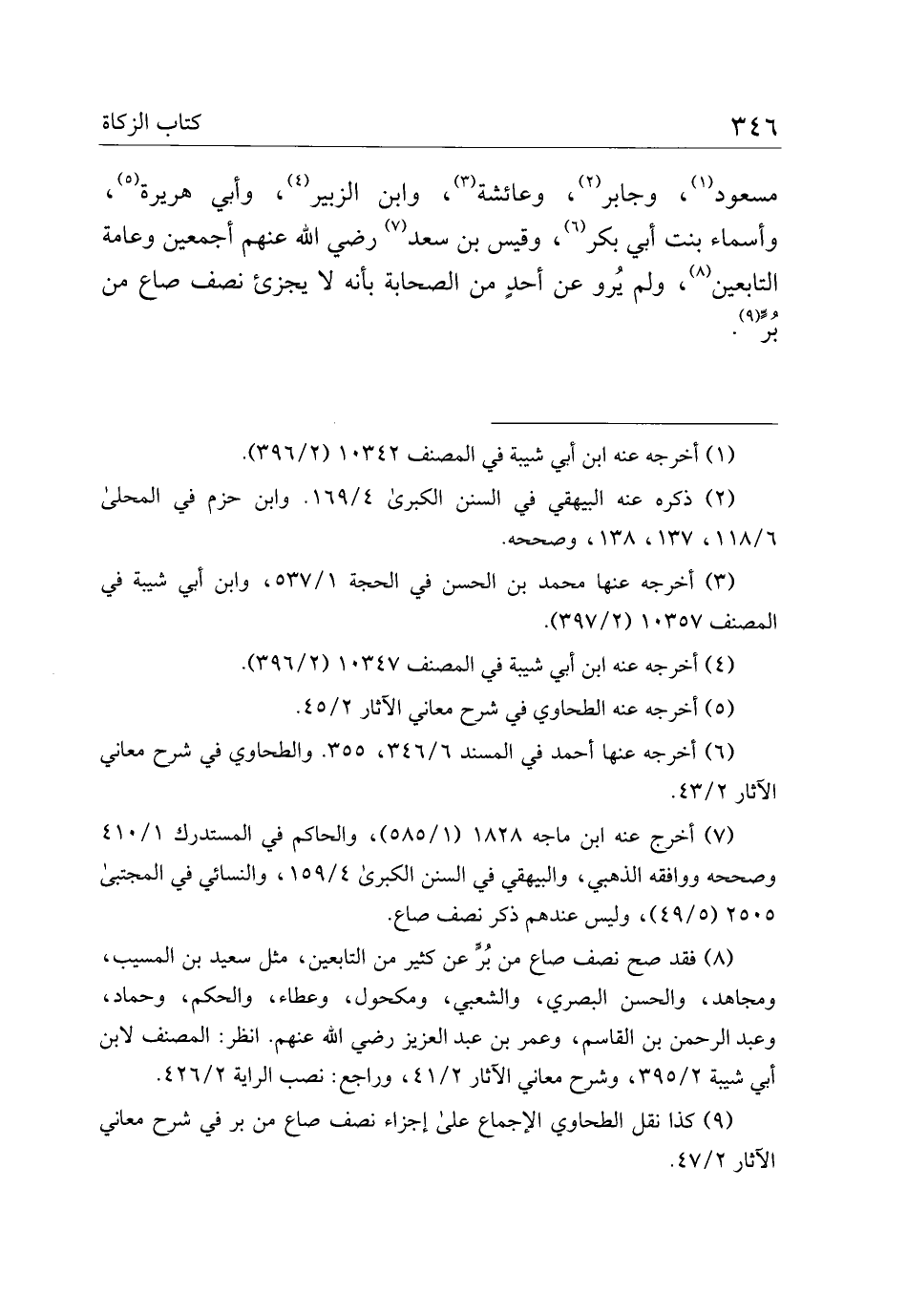 مسعود، وجابر، وعائشة، وابن الزبير، وأبي هريرة، وأسماء بنت أبي بكر، وقيس بن سعد رضي الله عنهم أجمعين وعلى التابعين، ولم يرو عن أحد من الصحابة بأنه لا يجزى نصف صاع من بر.