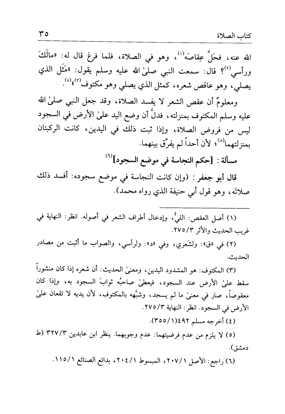 الله عنه، فخل عقاصه، وهو في الصلاة، فلما فرغ قاله: "مالك ورأسي؟ قال: سمعت النبي صلى اهل عليه وسلم يقول: "مثل الذي يصلي، وهو عاقص شعره، كمثل الذي يصلي وهو مكتوب".