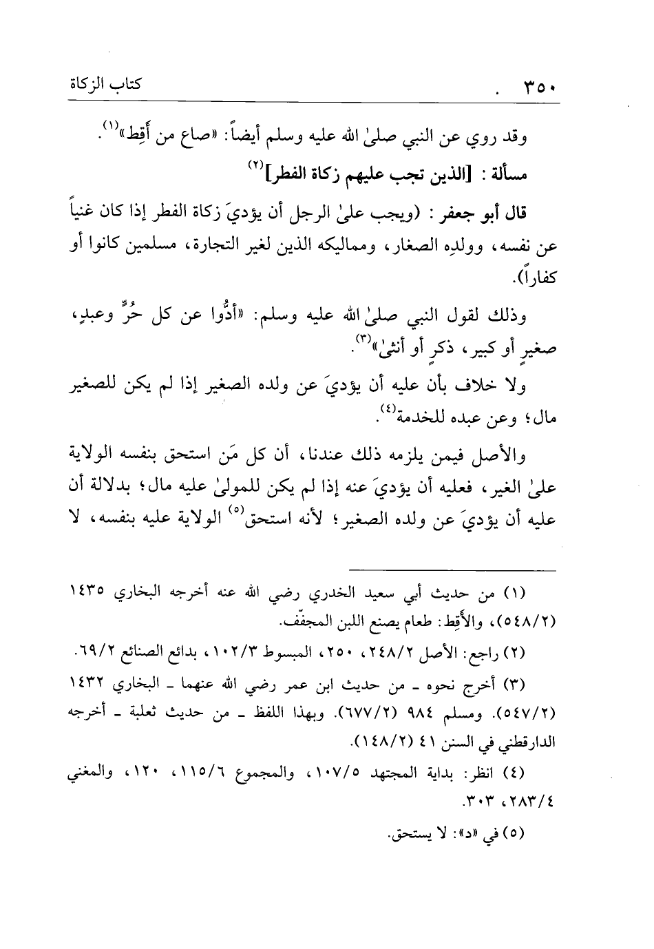 قال أبو جعفر: (ويجب على الرجل أن يؤدي زكاة الفطر إذا كان غنيا عن نفسه، وولده الصغار، ومماليكه الذين لغير التجارة، مسلمين كانوا أو كفارا).