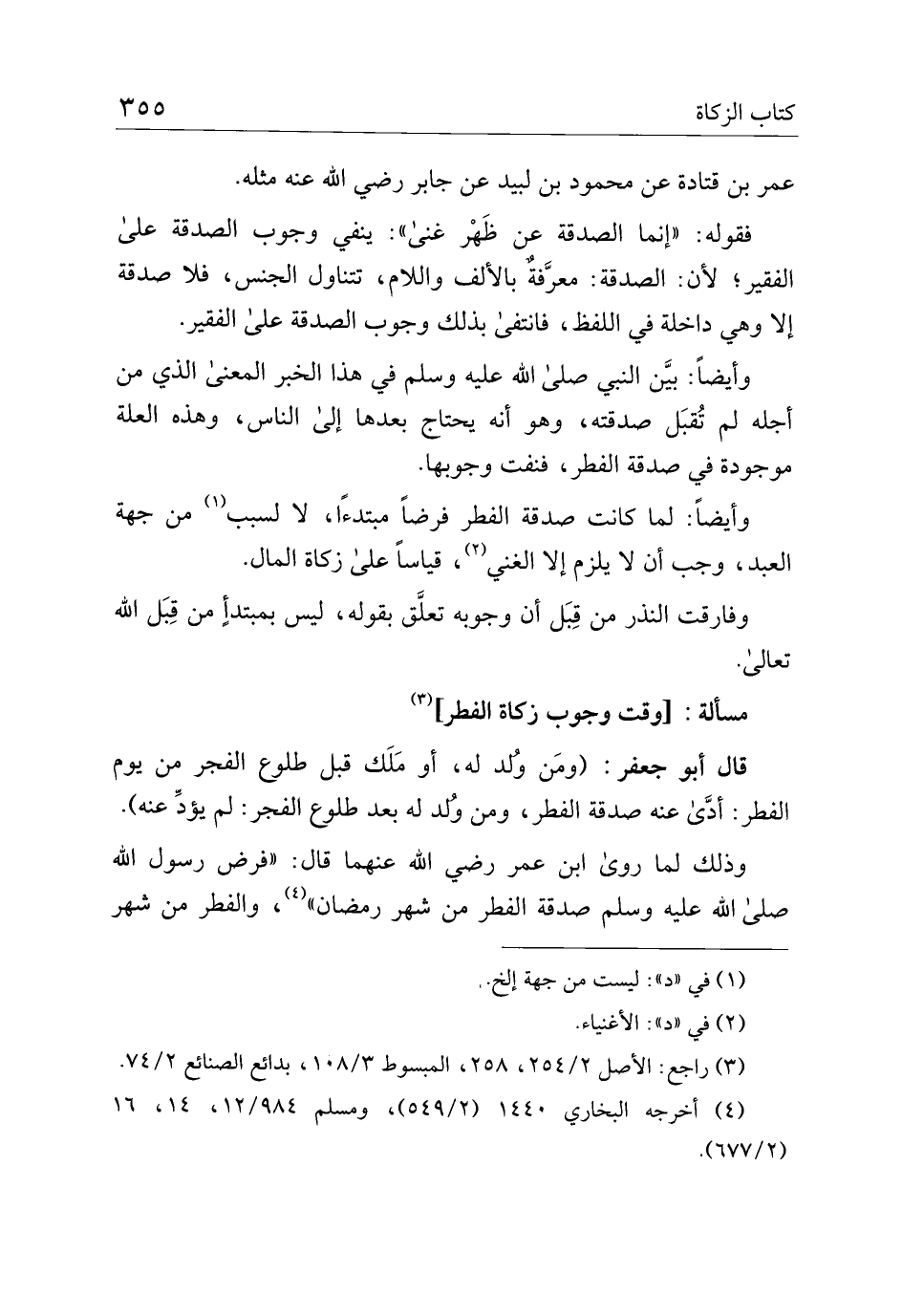قال أبو جعفر: (ومن ولد له، أو ملك قبل طلوع الفجر من يوم الفطر: أدى عنه صدقة الفطر، ومن ولد له بعد طلوع الفجر: لم يؤد عنه).