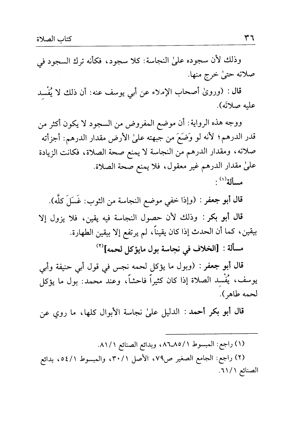 قال أبو جعفر: (وبول ما يؤكل لحمه نجس في قول أبي حنيفة وأبي يوسف، يفصد الصلاة إذا كان كثيرًا فاحشًا، وعند محمد: بول ما يؤكل لحمه طاهر).