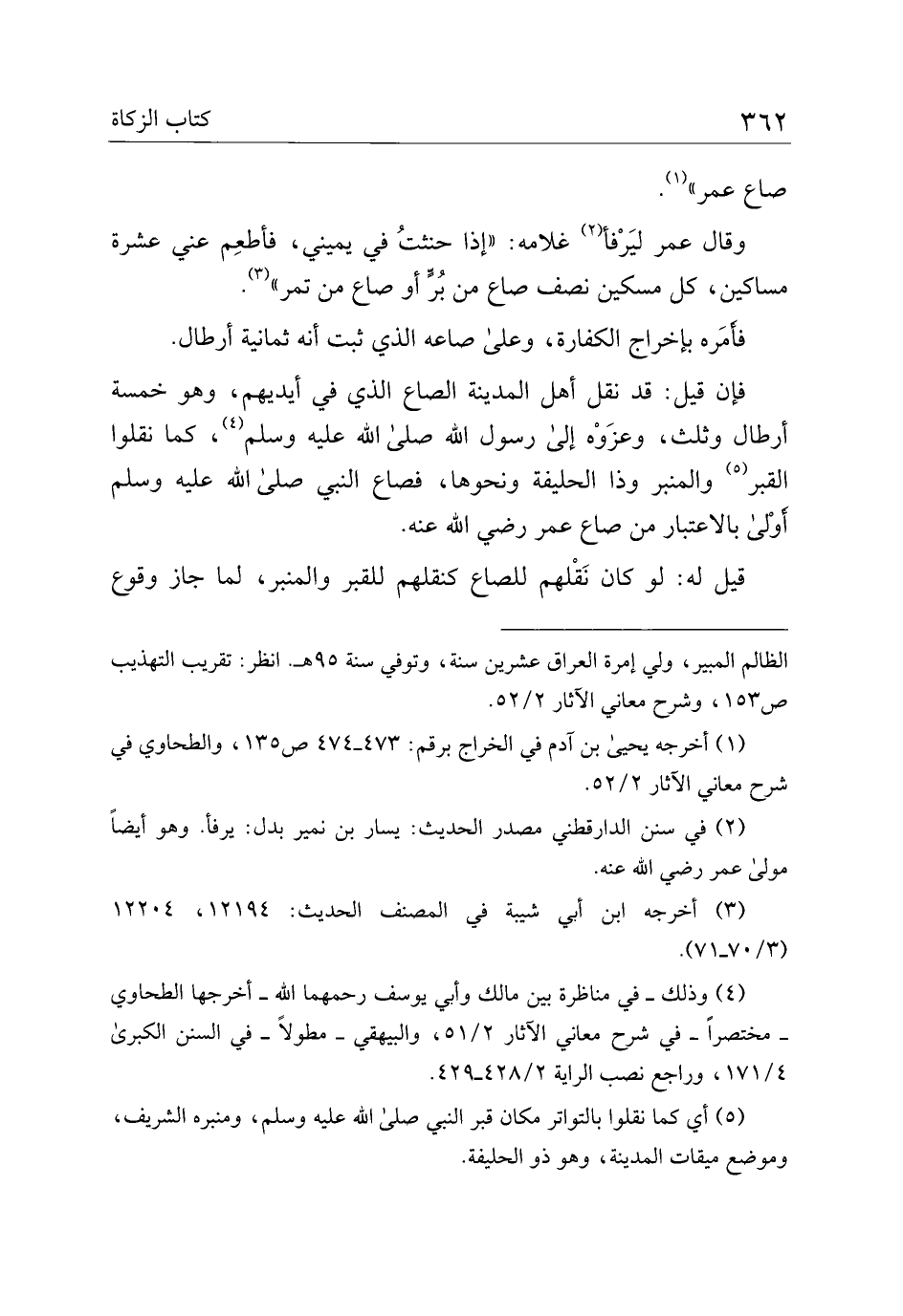 فإن قيل: قد نقل أهل المدينة الصاع الذي في أيديهم، وهو خمسة أرطال وثلث، وعزوه إلى رسول الله صلى الله عليه وسلم، كما نقلوا القبر والمنبر وذا الحليفة ونحوها، فصاع النبي صلى الله عليه وسلم أولى بالاعتبار من صاع عمر رضي الله عنه.