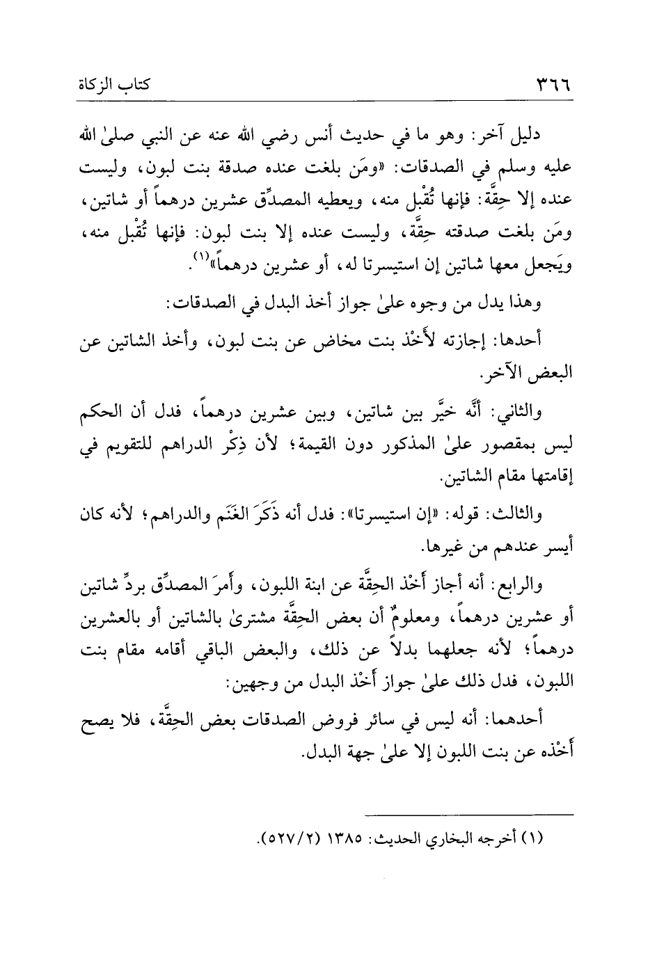 والرابع: أنه أجاز أخذ الحقة عن ابنة اللبون، وأمر المصدق برد شاتين أو عشرين درهمًا، ومعلوم أن بعض الحقة مشترى بالشاتين أو بالعشرين درهمًا؛ لنه جعلهما بدلًا عن ذلك، والبعض الباقي أقامه مقام بنت اللبون، فدل ذلك على جواز أخذ البدل من وجهين: