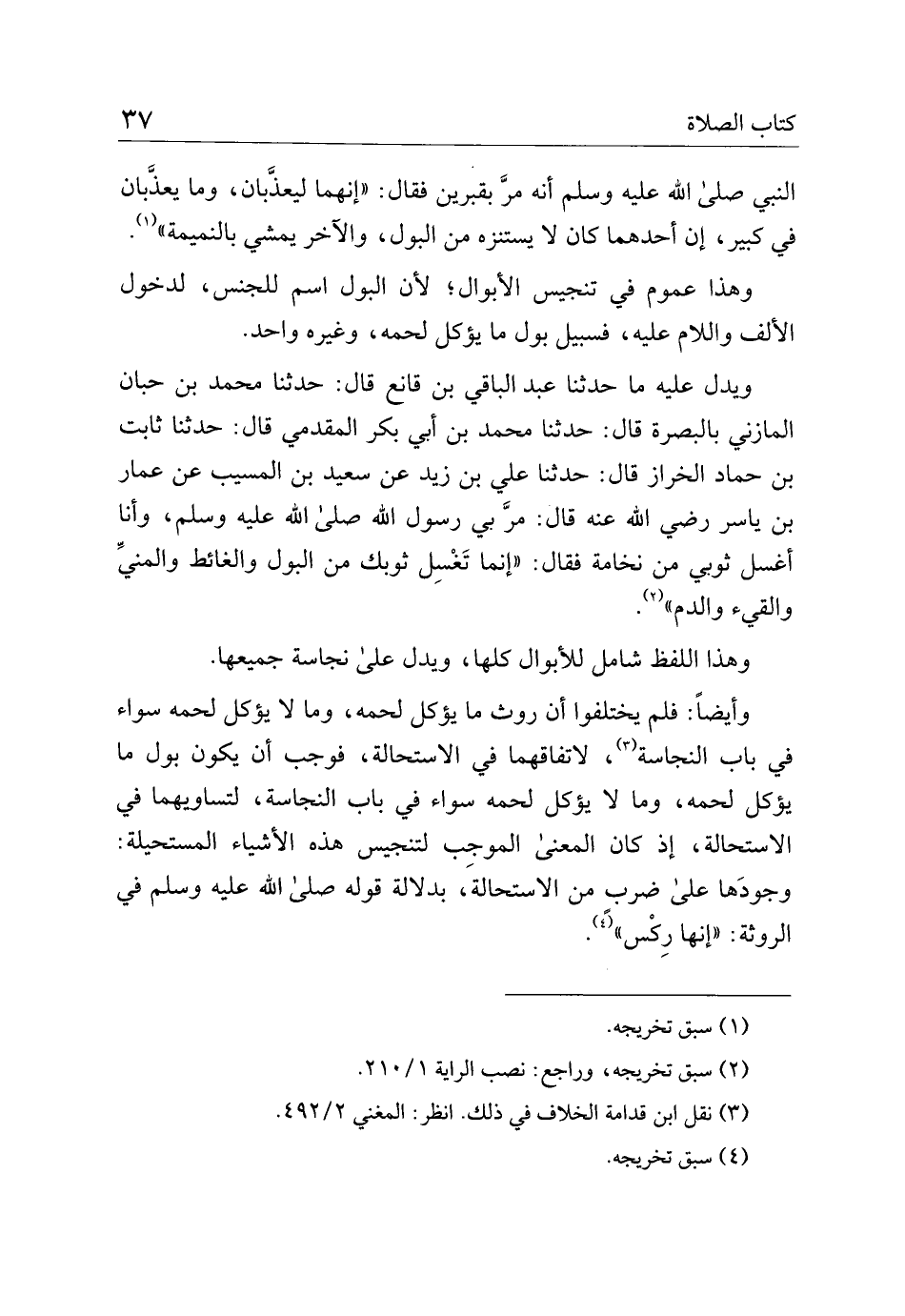 وهذا عموم في تنجيس الأبوال؛ لأن البول اسم للجنس، لدخول الألف واللام عليه، فسبيل بول ما يؤكل لحمه، وغيره واحد.