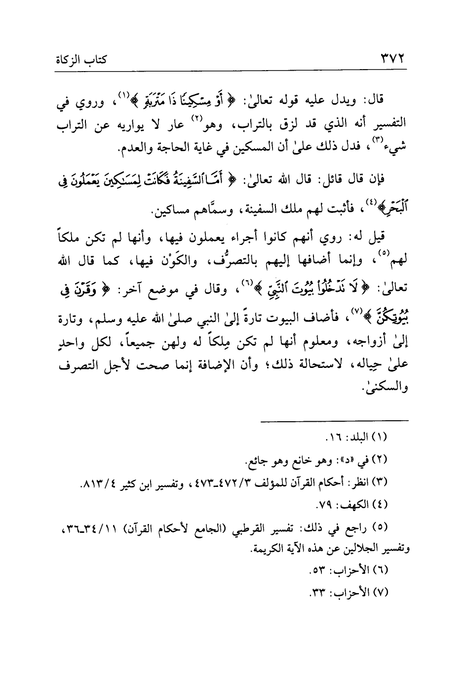فإن قال قائل: قال الله تعالى: {أما السفينة فكانت لمساكين يعملون في البحر}، فأثبت لهم ملك السفينة، وسماهم مساكين.