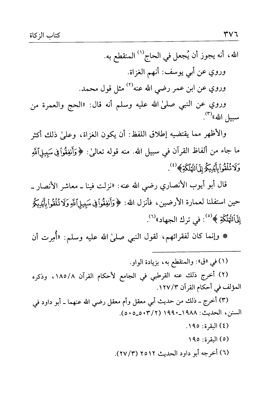 والأظهر مما يقتضيه إطلاق اللفظ: أن يكون الغزاة، وعلى ذلك أكثر ما جاء من ألفاظ القرآن في سبيل الله. منه قوله تعالى: {وأنفقوا في سبيل الله ولا تلقوا بأيديكم إلى التهلكة}.