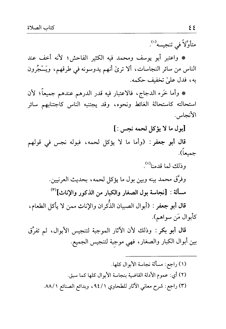 قال أبو جعفر (أبوال الصبيان الذكران والإناث ممن لا يأكل الطعام، كأبوال من سواهم).