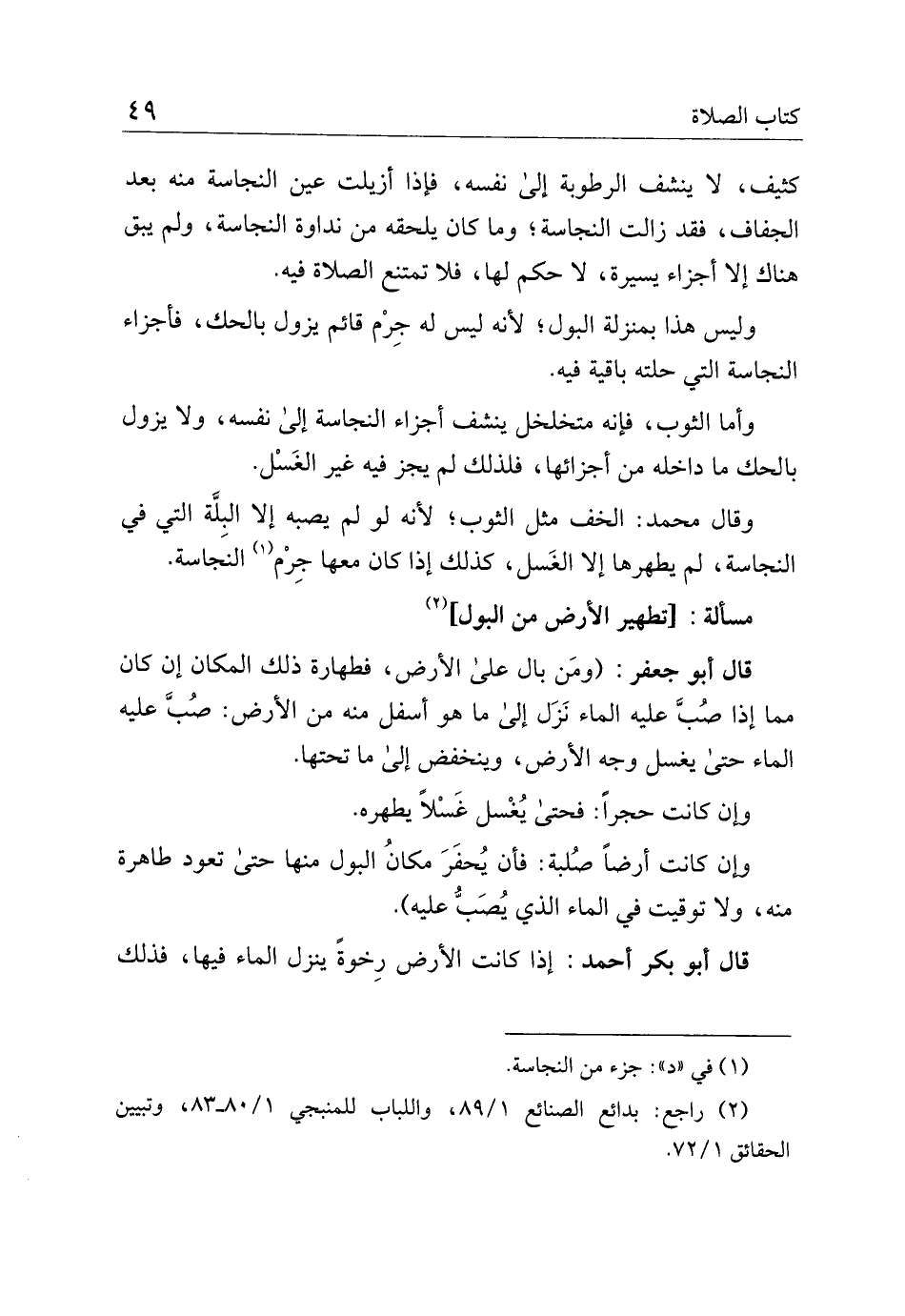 قال أبو جعفر: (ومن بال على الأرض، فطهارة ذلك المكان إن كان مما إذا صب عليه الماء نزل إلى ما هو أسفل منه من الأرض: صب عليه الماء حتى يغسل وجه الأرض، وينخفض إلى ما تحتها.
