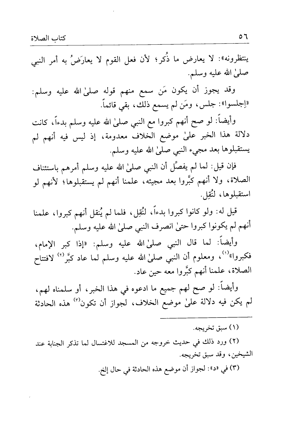قيل له: ولو كانوا كبروا بدءًا، لنقل، فلما لم ينقل أنهم كبروا، علمنا أنهم لم يكونوا كبروا حتى انصرف النبي صلى الله عليه وسلم.