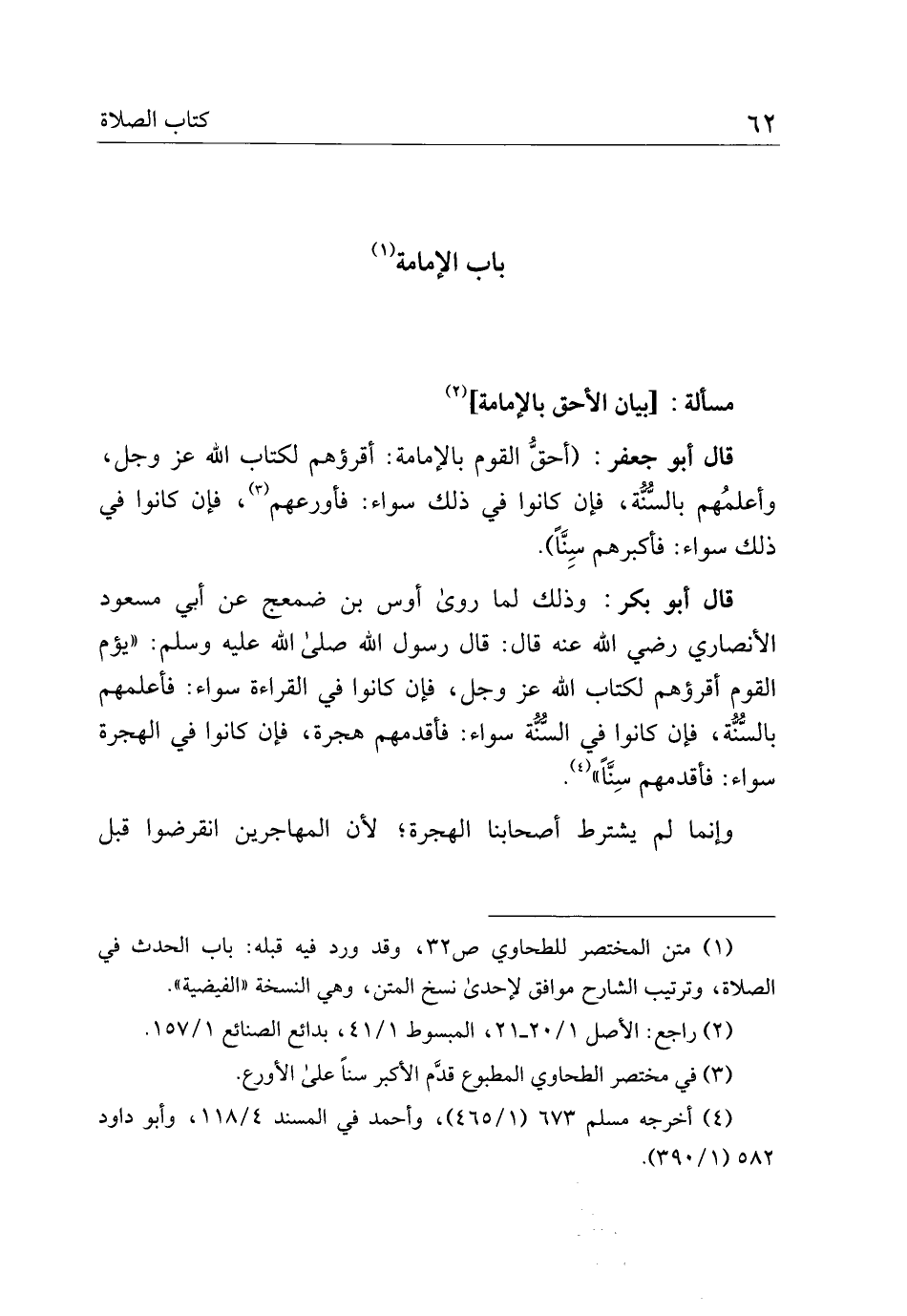 قال أبو جعفر: (أحق القوم بالإمامة: أقرؤهم لكتاب الله عز وجل، وأعلمهم بالسنة، فإن كانوا في ذلك سواء: فأورعهم، فإن كانوا في ذلك سواء: فأكبرهم سنًا).