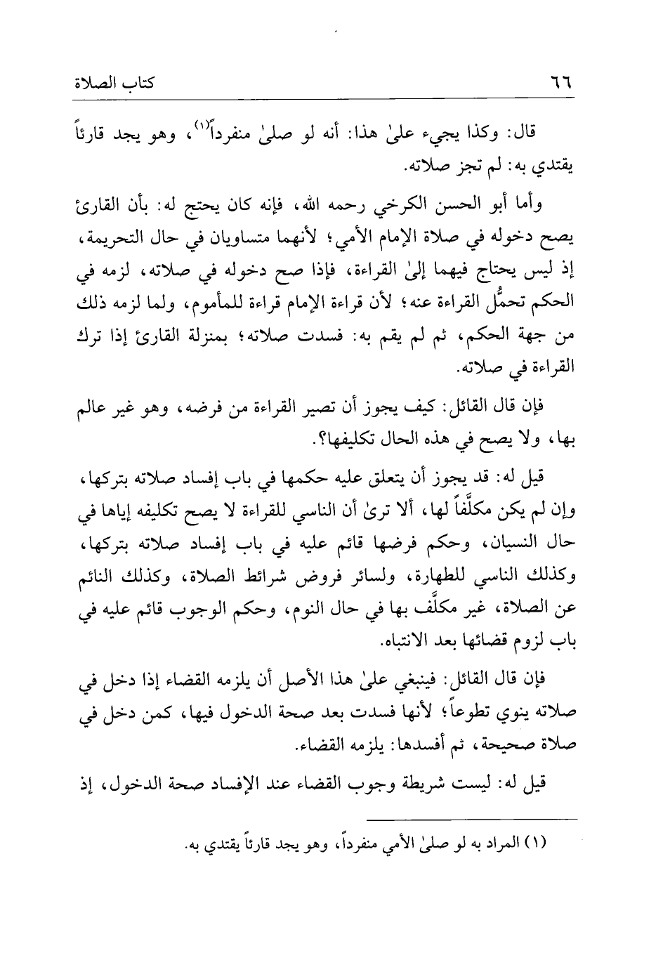وأما أبو الحسن الكرخي رحمه الله، فإنه كان يحتج له: بأن القارئ يصح دخوله في صلاة الإمام الأمي؛ لأنهما متساويان في حال التحريمة، إذ ليس يحتاج فيهما إلى القراءة، فإذا صح دخوله في صلاته، لزمه في الحكم تحمل القراءة عنه؛ لأن قراءة الإمام للمأموم، ولما لزمه ذلك من جهة الحكم، ثم لم يقم به: فسدت صلاته؛ بمنزلة القارئ إذا ترك القراءة في صلاته.