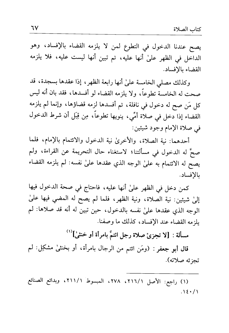 وكذلك مصلي الخامسة على أنها رابعة الظهر، إذا عقدها بسجدة، قد صحت له الخامسة تطوعًا، ولا يلزمه القضاء لو أفسدها، فقد بان أنه ليس كل من صح له في نافلة، ثم أفسدها لزمه قضاؤها، وإنما لم يلزمه القضاء إذا دخل في صلاة أمي، ينويها تطوعًا، من قبل أن شرط الدخول في صلاة الإمام وجود شيئين: