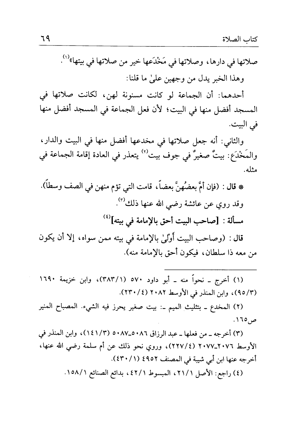 والثاني: أنه جعل صلاتها في مخدعها أفضل منها في البيت والدار، والمخدع: بيت صغير في جوف بيت يتعذر في العادة إقامة الجماعة في مثله.