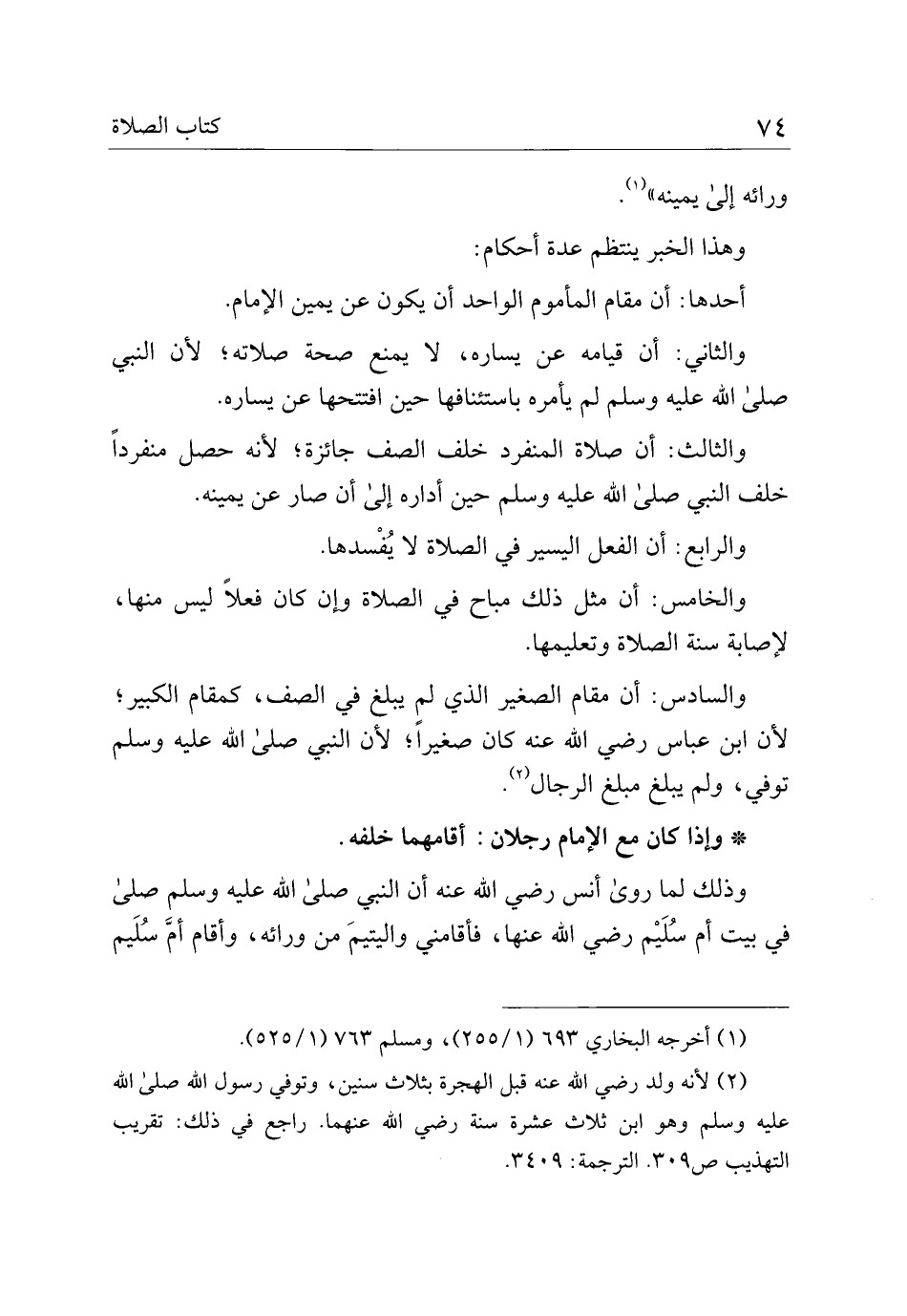 والسادس: أن مقام الصغير الذي لم يبلغ في الصف، كمقام الكبير؛ لأن ابن عباس رضي الله عنه كان صغيرًا؛ لأن النبي صلى الله عليه وسلم توفي، ولم يبلغ مبلغ الرجال.