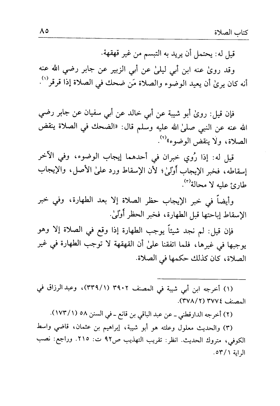 فإن قيل: روى أبو شيبة عن أبي خالد عن أبي سفيان عن جابر رضي الله عنه عن النبي صلى الله عليه وسلم قال: "الضحك في الصلاة ينقض الصلاة، ولا ينقض الوضوء".
